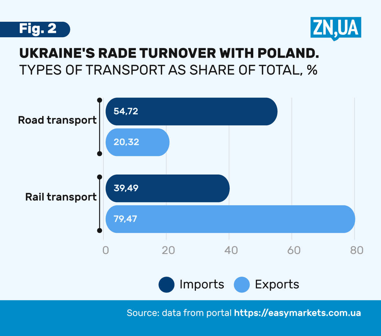 At the same time, we will not see any parity if we look at the volumes of Ukrainian exports to Poland. While truckers are the only ones not to go into the deep red, their surplus is only 3.8% in tons and minus 21% in money, compared to three quarters of last year. Compare it with the indicators of Polish colleagues and feel the difference, as they say. After all, if road transport accounts for more than half of all types of transport by which goods are delivered in Poland, in Ukraine only 20% of goods go to Poland by car and 80% by rail (see Picture 3). Did these 20% create such non-competitive conditions in the domestic Polish market as to cause protests?