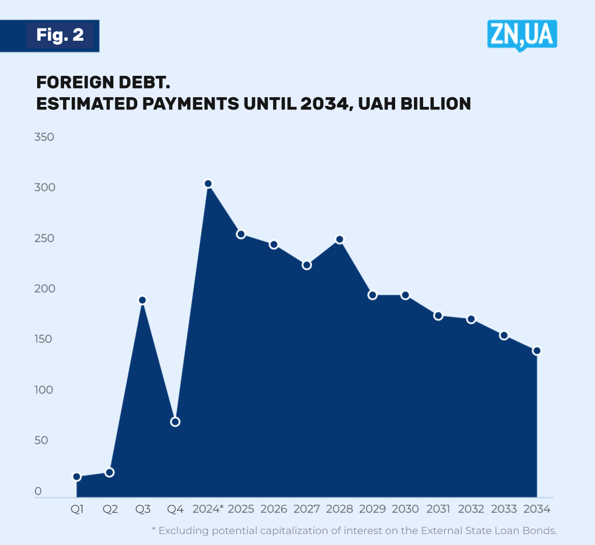 To assess the speed of the approaching crisis, it is worth looking at our projected payments on foreign loans: the first quarter of 2024 —19.8 billion UAH, the second quarter of 2024 — 23.05 billion UAH, the third quarter of 2024 — immediately almost 195 billion UAH. Yes, later in the fourth quarter, there will be a "slight" decrease to UAH 75 billion, but this will be only a short pause to take a breath before the multi-year marathon of foreign debt repayment (see Fig. 2).
