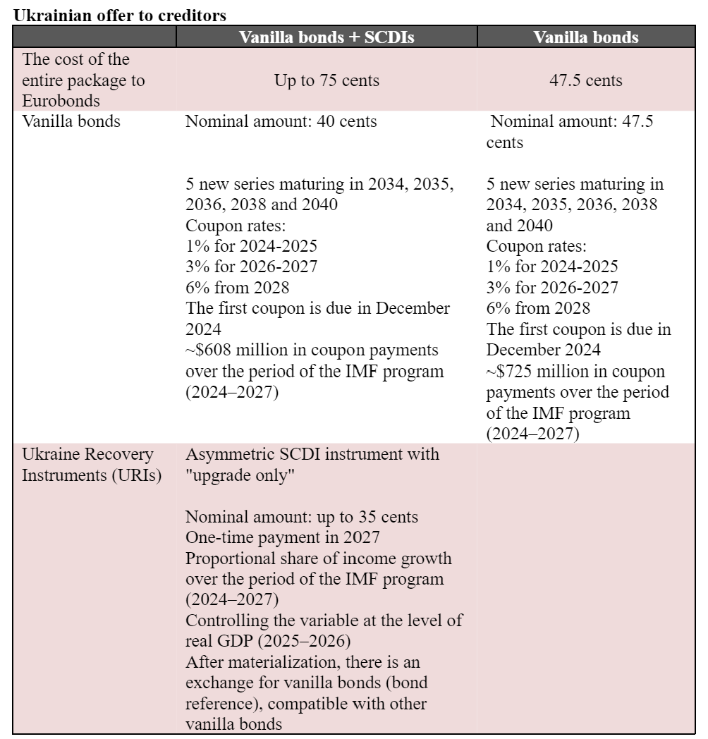 Instead, the creditors offered the Ukrainian side a slightly different option, namely a set of two instruments. The first of them is actually our vanilla bonds, simple bonds that will exchange 40% of the principal amount of the debt for Eurobonds and interest. The only difference is that the rate for them will be 7.75% immediately, with payments in 2034 and 2035... The second instrument — Recovery Bond — is more complicated, with a variable coupon, although also with a write-off of 62.5 %, but the rest of the conditions are tied to the compliance of our economic results with the predictions of the International Monetary Fund (IMF) and, as in the case of Yaresko's Gross Domestic Product (GDP) warrants, God forbid economic growth will still happen.