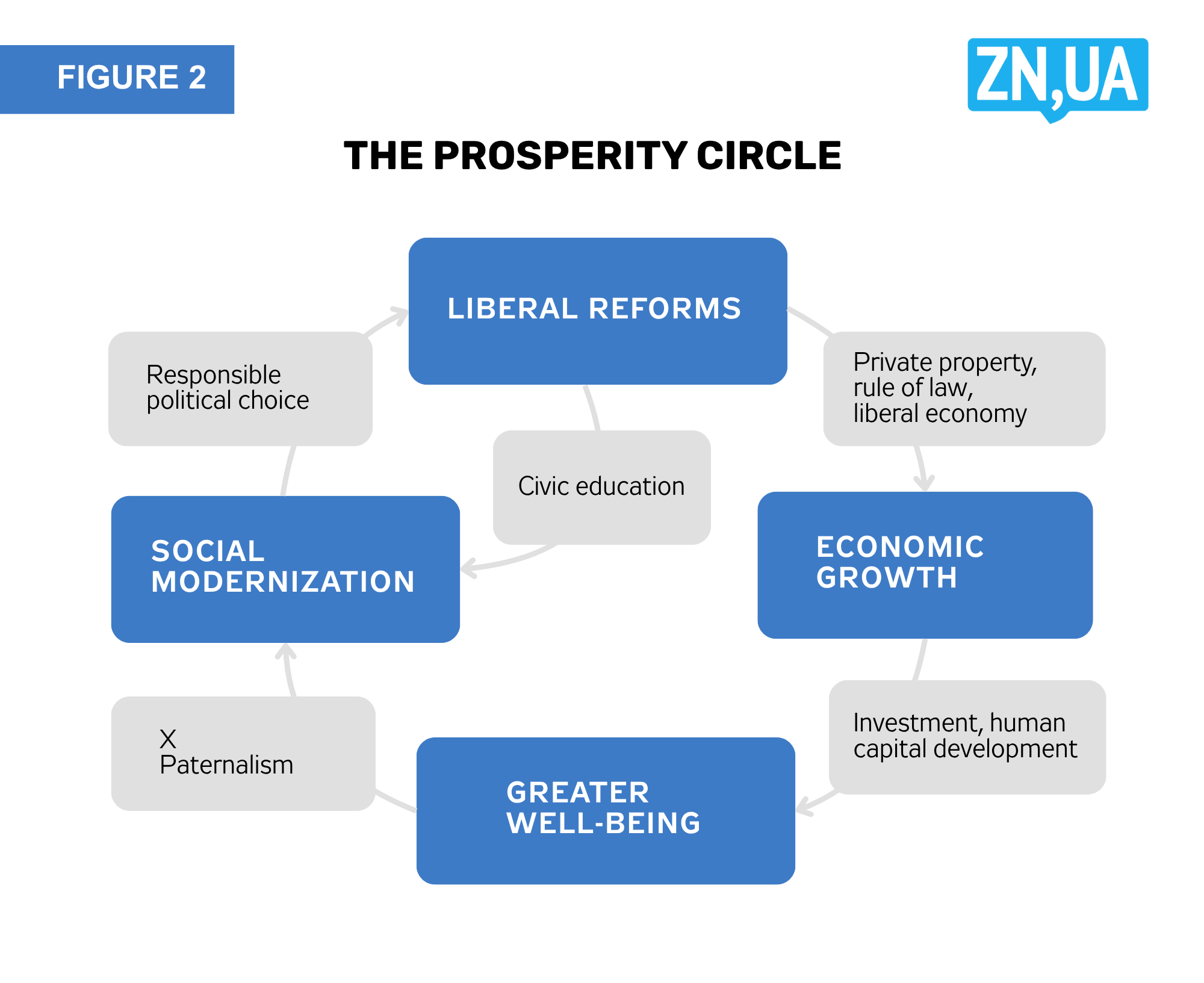 The only way out of this situation is through societal modernization and rapid economic growth. Figure 2 illustrates the circle that leads to prosperity.