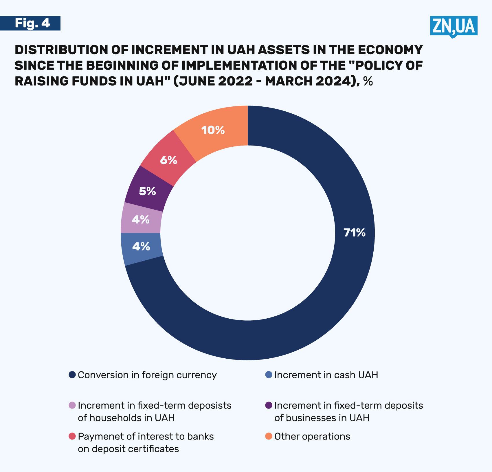 From the beginning of the implementation of the "policy of attracting hryvnia assets" (from June 2022) and until March 2024, UAH 2.6 trillion came into the banking system, mainly as a result of financing the fiscal deficit at the expense of international aid funds.