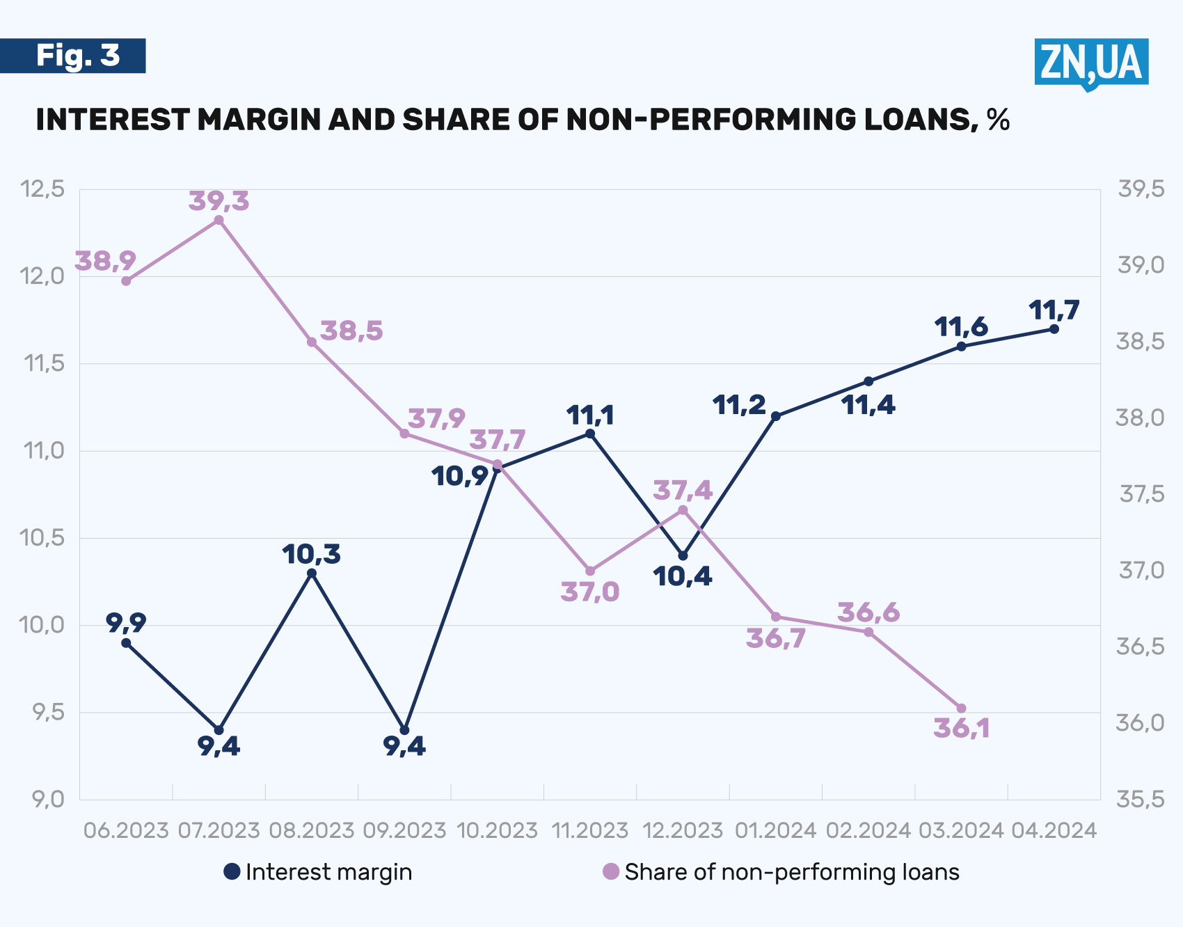 The interest margin of Ukrainian banks remains not only record high, it also continues to expand, despite the illogical decrease in the share of problem loans in bank portfolios (see Fig. 3).