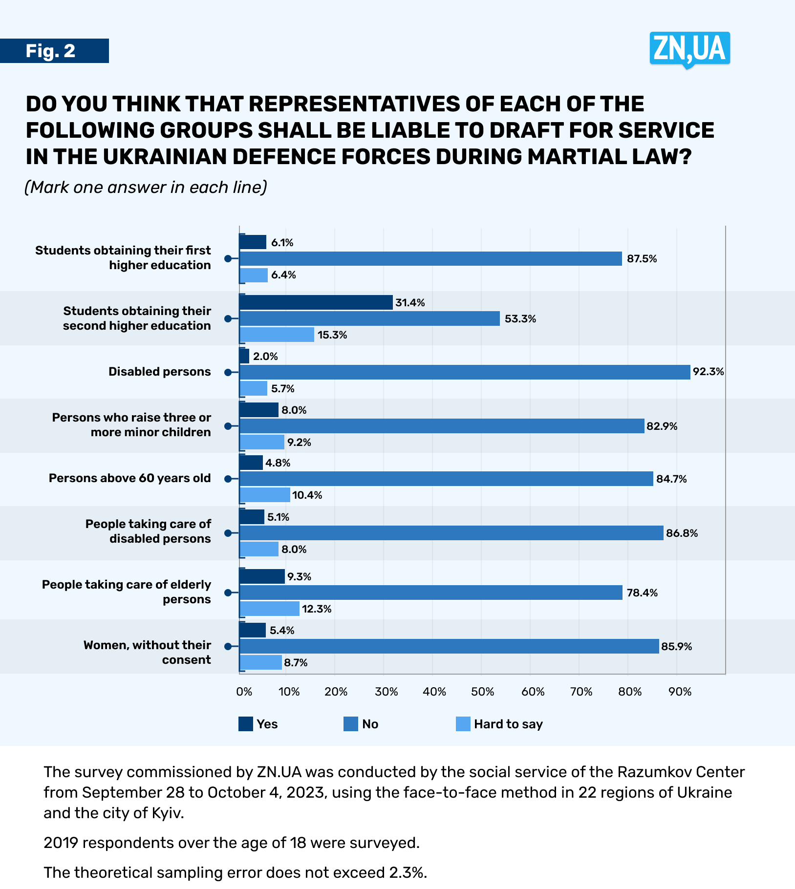 Moreover, the legislation provides quite a sufficient number of legal ways to avoid being called up. And judging by the same survey (the question was: “In your opinion, should representatives of each of these groups be subject to conscription into the Ukrainian Defense Forces during martial law?”), society willingly supports them (see Fig. 2). All categories that are not currently subject to mobilization are “approved” by respondents of both sexes as follows: persons with disabilities – 92.3% (91.6% of men, 92.8% of women chose this option); students receiving their first higher education – 87.5% (86% and 88.8%, respectively); custodians of persons with disabilities – 86.8% (85.7% and 87.9%); women, without their consent – 85.9% (85.2% and 86.5%); persons over 60 years old – 84.7% (84.5% and 85%); persons with three or more minor children – 82.9% (82.9% each); custodians of elderly people – 78.4% (77.9% and 78.8%); students receiving a second higher education – 53.3% (52.2% and 54.1%).