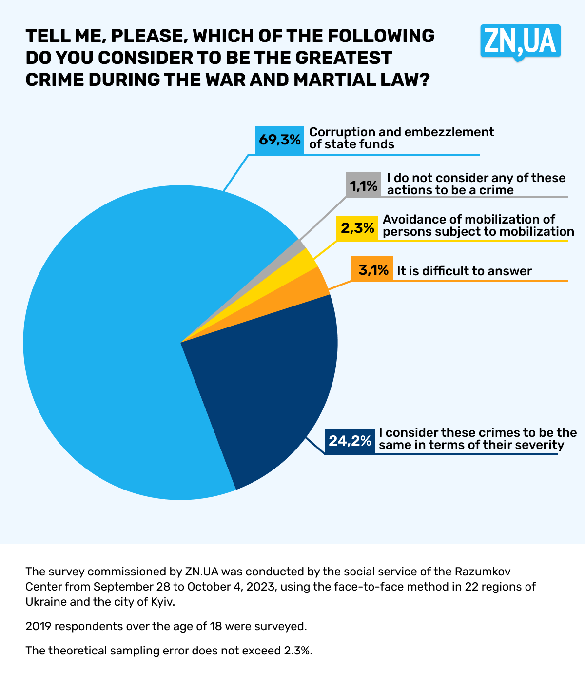 As a result (see Fig. 1), corruption “won” in this so-called competition by a landslide. It is considered the greatest crime by 69.3% of Ukrainians. 2.3% of Ukrainians “voted” for avoiding the mobilization of those who are subject to it. 24.2% of respondents recognized these phenomena as crimes of equal gravity...