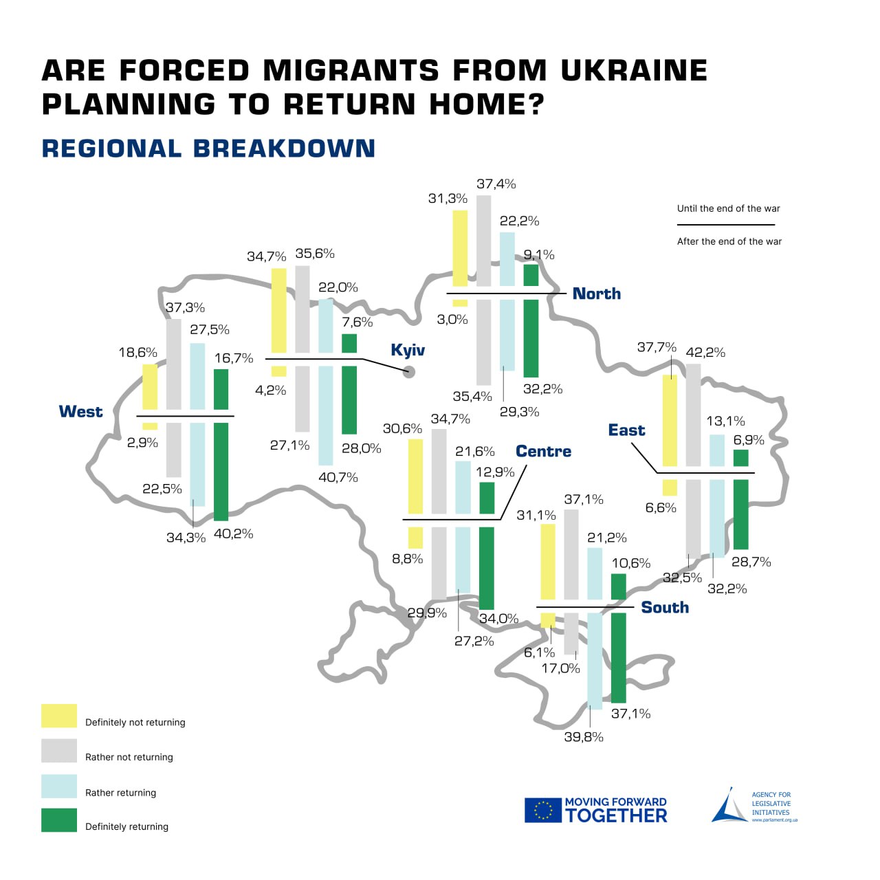 The problem of mass migration abroad could be at least smaller. The study showed that 38% of forced migrants considered the option of staying in Ukraine in safer regions. If we count from 6 million forced migrants, about 2.3 million could remain in Ukraine, receiving the status (at least for a while) of internally displaced persons IDPs.