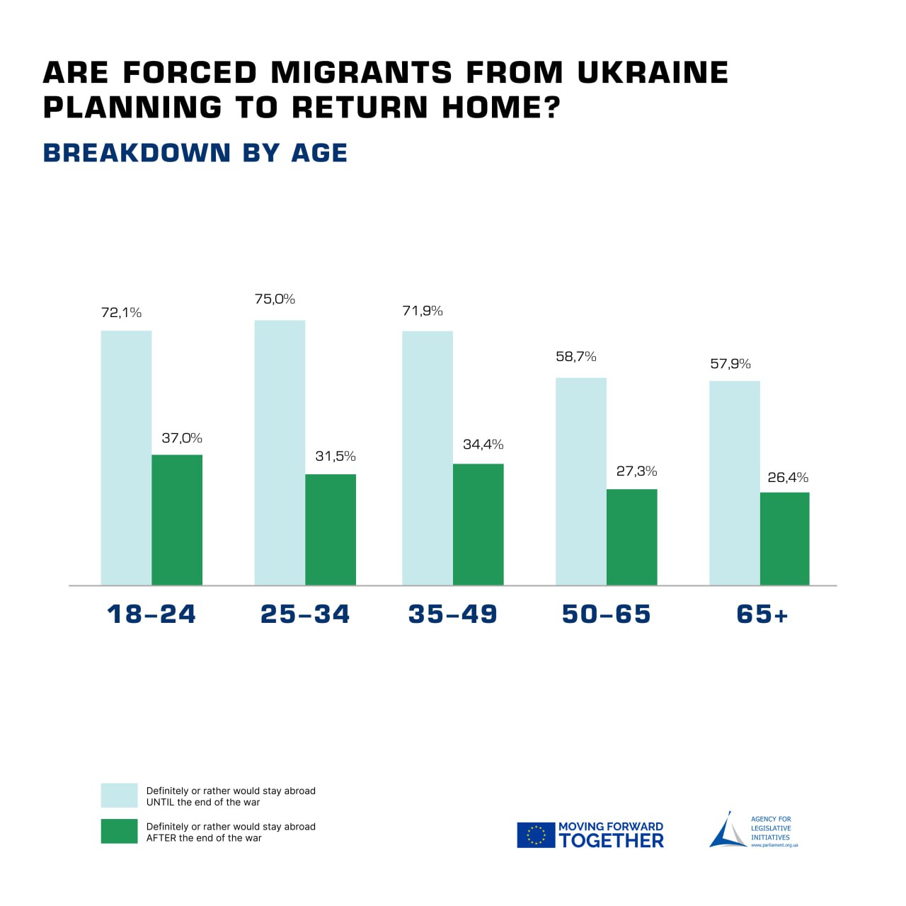 That is, a third of forced migrants do not plan to return at all, and the vast majority will not return in the foreseeable future. The age distribution is also quite disappointing – the younger the person, the less likely this person is to return.