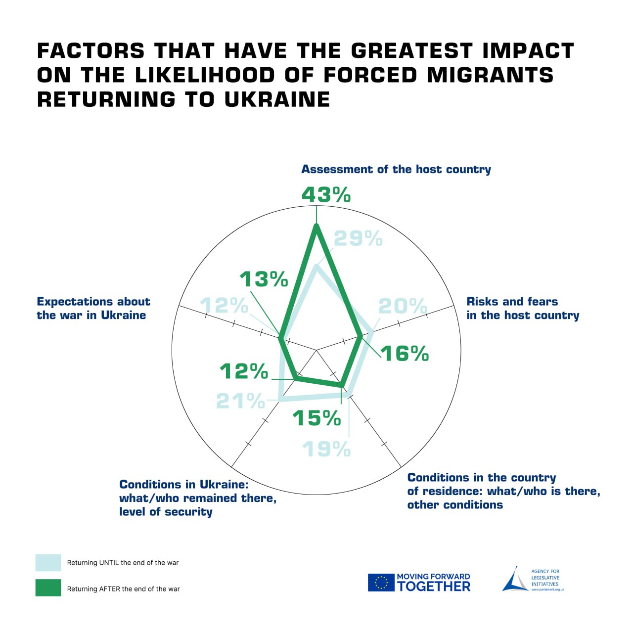 The group of factors related to the assessment of the host country, that is, how satisfied the forced migrants are with the quality of life in the host country, turned out to be the most important. Starting from purely practical issues (for example, the quality of education, medicine, employment opportunities, the service sector, the quality of infrastructure, etc.) and ending with more general issues (for example, the closeness of the mentality of the population of the host country). It is this group of factors that determine 29% of the decision to return before the end of the war and 43% after the end (if we imagine the decision to return as 100%). Other groups range from 12 to 21%. Moreover, the most important reason that reduces the desire to return is the expectation of a low quality of life in Ukraine. It is worth noting that 60% of respondents indicated this reason.