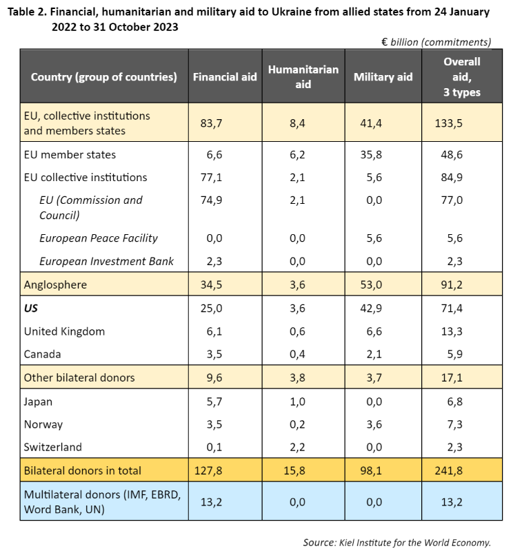 As for the total financial, military and humanitarian aid to Ukraine since the beginning of the war, its volume reached €255 billion at the beginning of November (data from the Kiel Institute). The EU and its member states have documented €133.5 billion in aid to Ukraine, including €83.7 billion in financial aid and €41.4 billion in military aid (see Table 2). Currently, the EU accounts for 55% of the aid of Western democracies to Ukraine. At the same time, the United States pledged to provide Ukraine with three types of aid in the amount of €71.4 billion, including €42.9 billion in military aid.