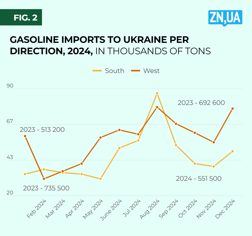 Gasoline flows shifted from the South to the West: slightly more than half (56 percent) of total imports entered through the western border. Compared to 2023, this direction saw an increase by 35 percent (692,600 tons).