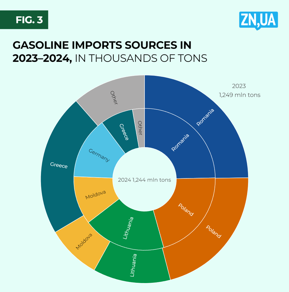 In 2021, it was no less inconceivable to imagine the supply of German gasoline to Ukraine than the import of American diesel. In 2024, it became commonplace. Germany soared from one gasoline tanker in 2023 to 175,800 tons in 2024, ranking fourth in the list of import sources.