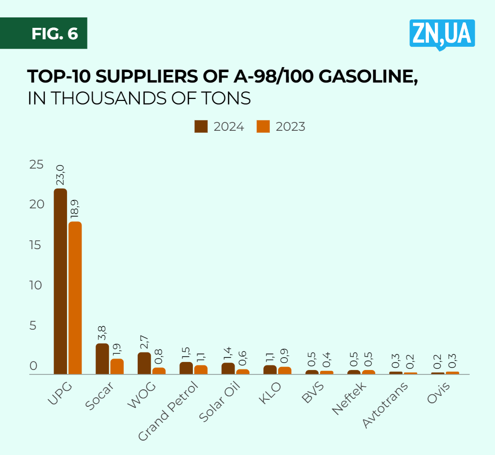 UPG remains the leader, accounting for 63% of the total volume — 23,000 tons, which is 21 percent more than in 2023. Almost all of the volume was imported from Germany. UPG maintains the largest network for the sale of A-100 — more than 70 filling stations. It is followed by WOG with 56 filling stations and KLO with 29.