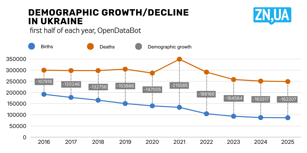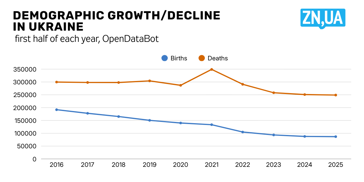According to OpenDataBot, in the first half of 2025 there were 86,795 newborns and 249,002 deaths (see table). As the data note, “Currently, there are three deaths for every newborn—and this ratio has held steady for the past five years... In ten years, the birth rate has fallen 2.2 times. While in 2016 an average of 32,000 babies were born per month, this year it is only 14,000.”