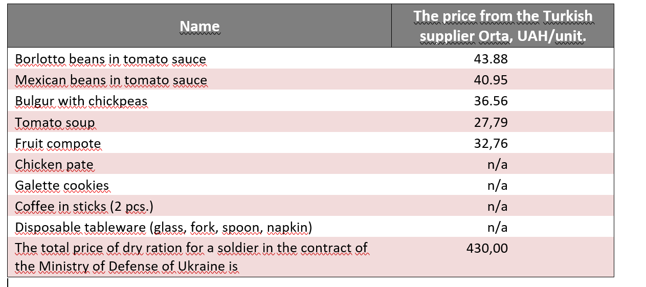 Currently, the cost of individual components in the contract of the Ministry of Defense of Ukraine is unknown. But the price at which "Tanos Technologies" bought components of dry rations from the Turkish company Orta Akdeniz Gumrok Ve Tiracet Bm is known. Beans, beans, bulgur, soup and compote together cost 181 hryvnias. Thus, chicken pate, cookies, coffee in sticks and disposable dishes cost as much as UAH 248. The journalists of the ZN.UA publishing house did not manage to find such expensive goods in the "Novus" store as to come up with a similar settlement amount.