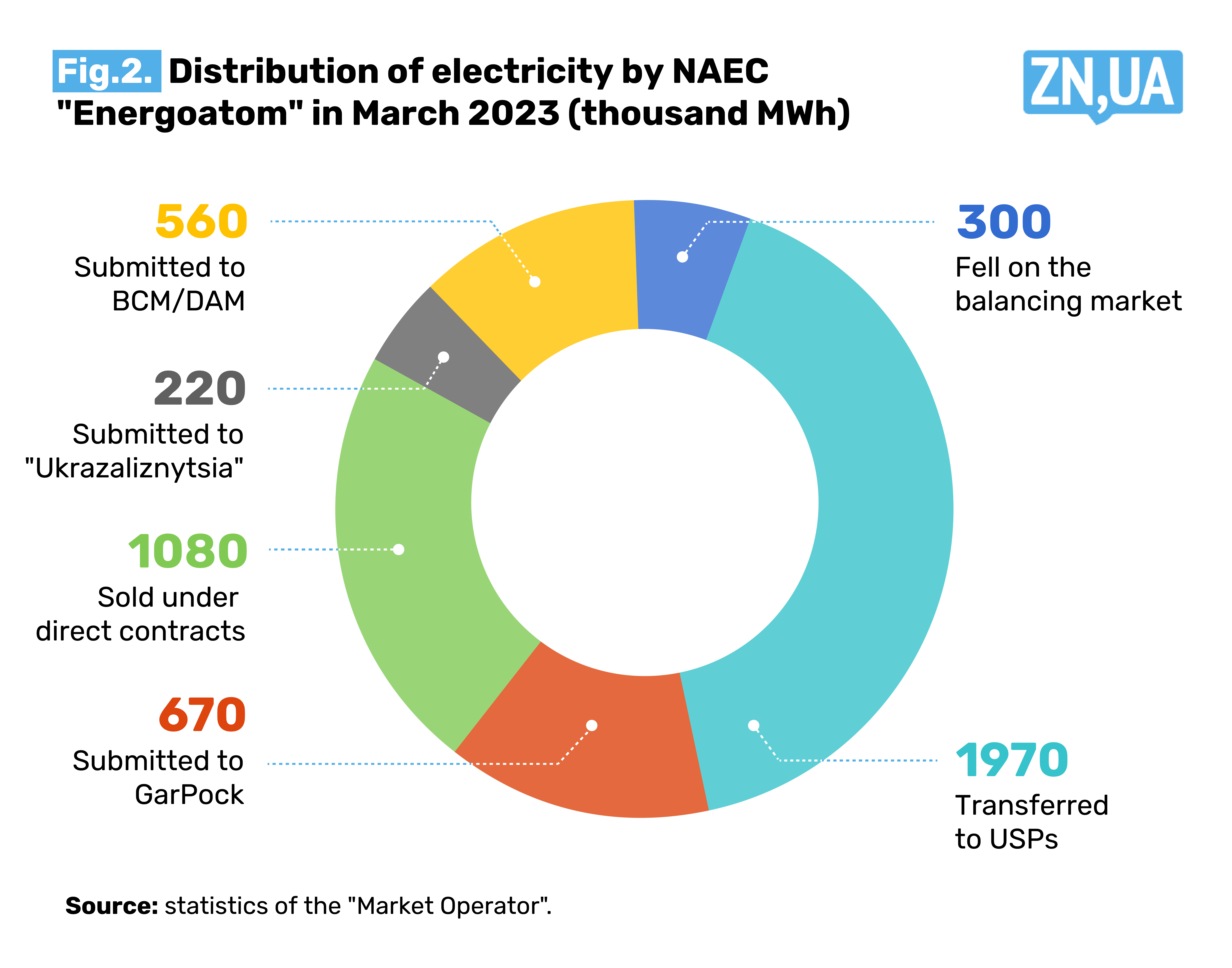 In March, the "Energoatom" company produced slightly less than 5 million MWh. Of these, it supplied 1.97 million MWh directly to universal service providers (USP), and sent another 0.67 million through the enterprise GarPok. Another 0.22 million MWh went to the joint-stock company "Ukrazaliznytsia" in accordance with the contract of November 2022 at a regulated preferential price of UAH 2,300/MWh.