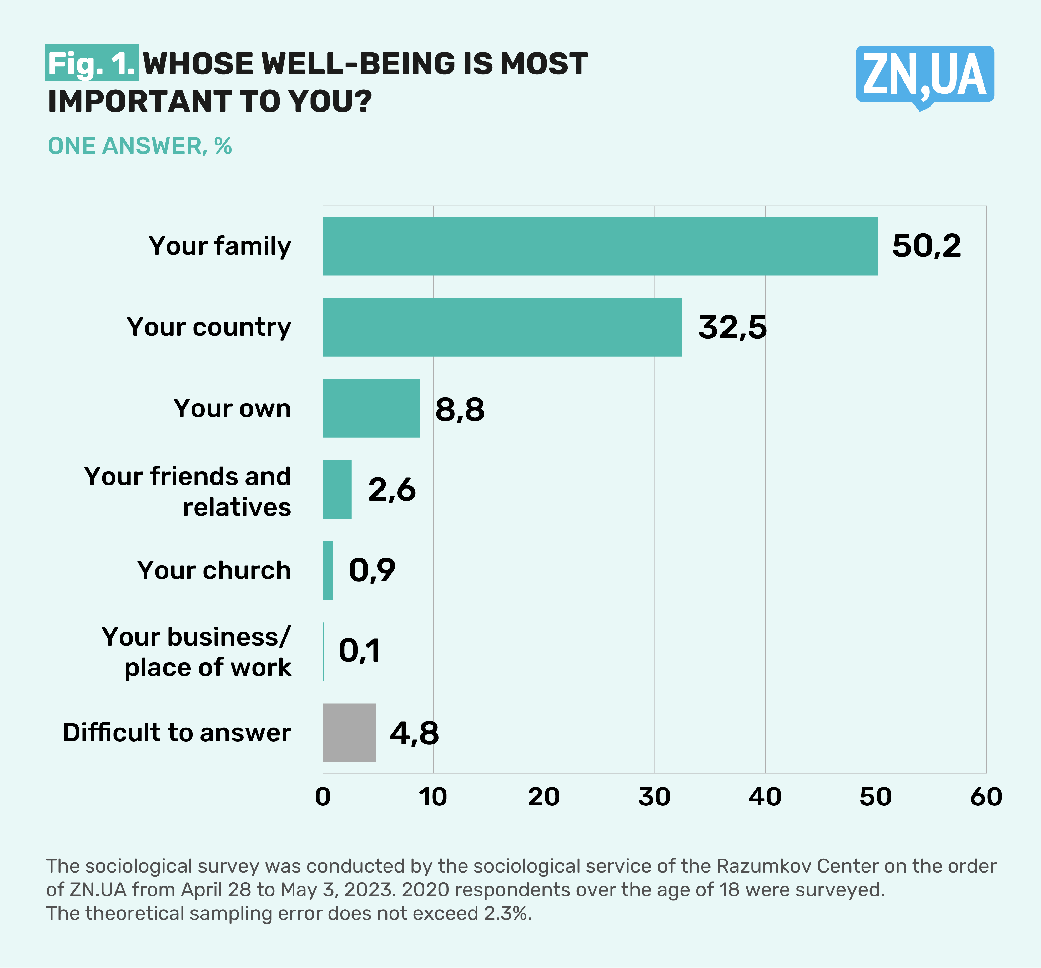 "Whose well-being is most important to you?" – we asked the citizens. And in second place, after the traditional well-being of their family (50.2%), the respondents, by a large margin from other answers, put the well-being of the country (32.5%). Own well-being was the most important for only 8.8%, and the well-being of friends and relatives – for 2.6% of people. (see Fig. 1)
