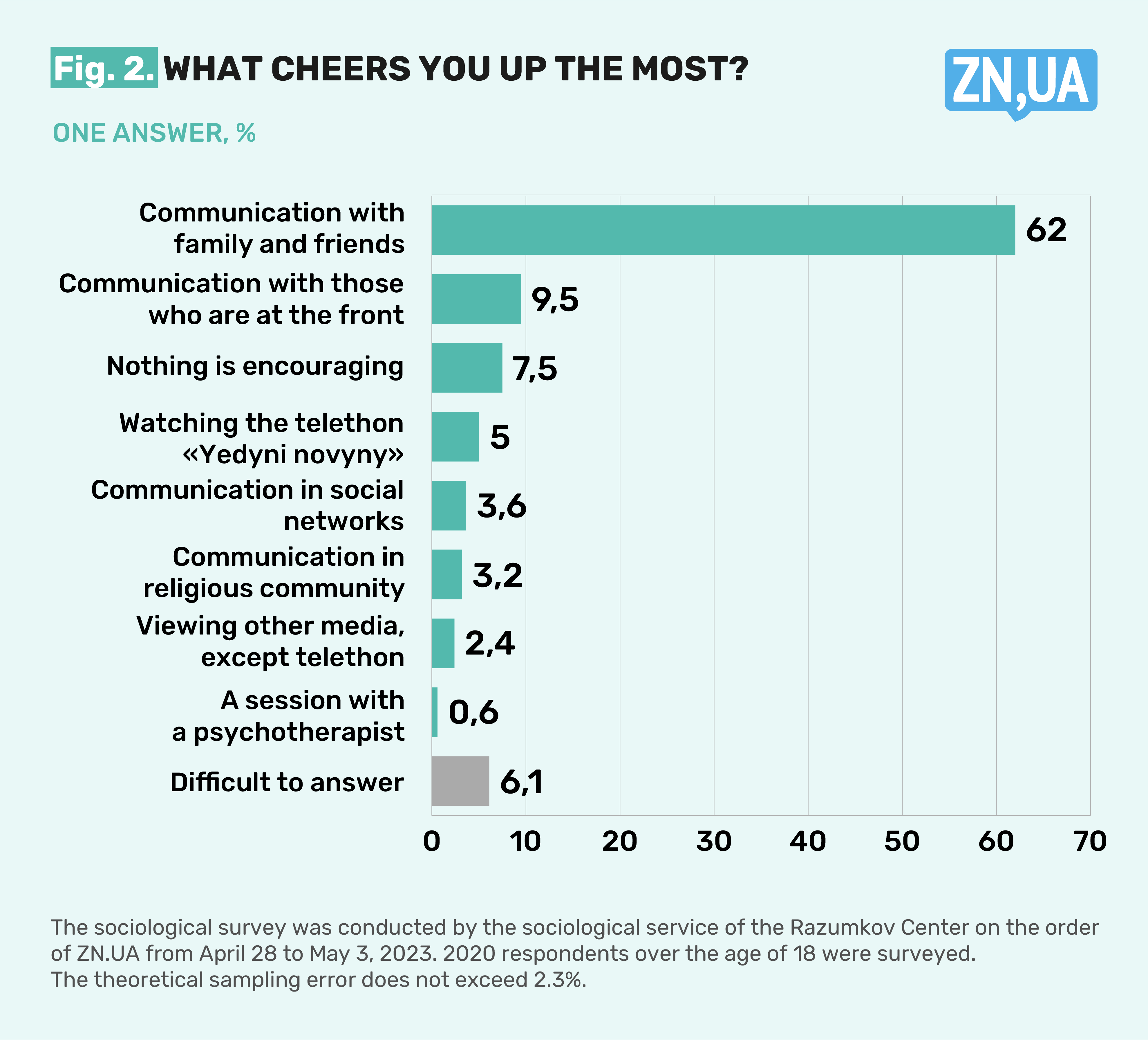 To the question "What cheers you up the most?" of the given options, the vast majority of respondents put "communication with family and friends" first (62%). In second place among the incentives that help the citizens of our country to be in a satisfactory psychological state, albeit by a large margin, is "communication with those who are at the front" (9.5%) (see Fig. 2).
