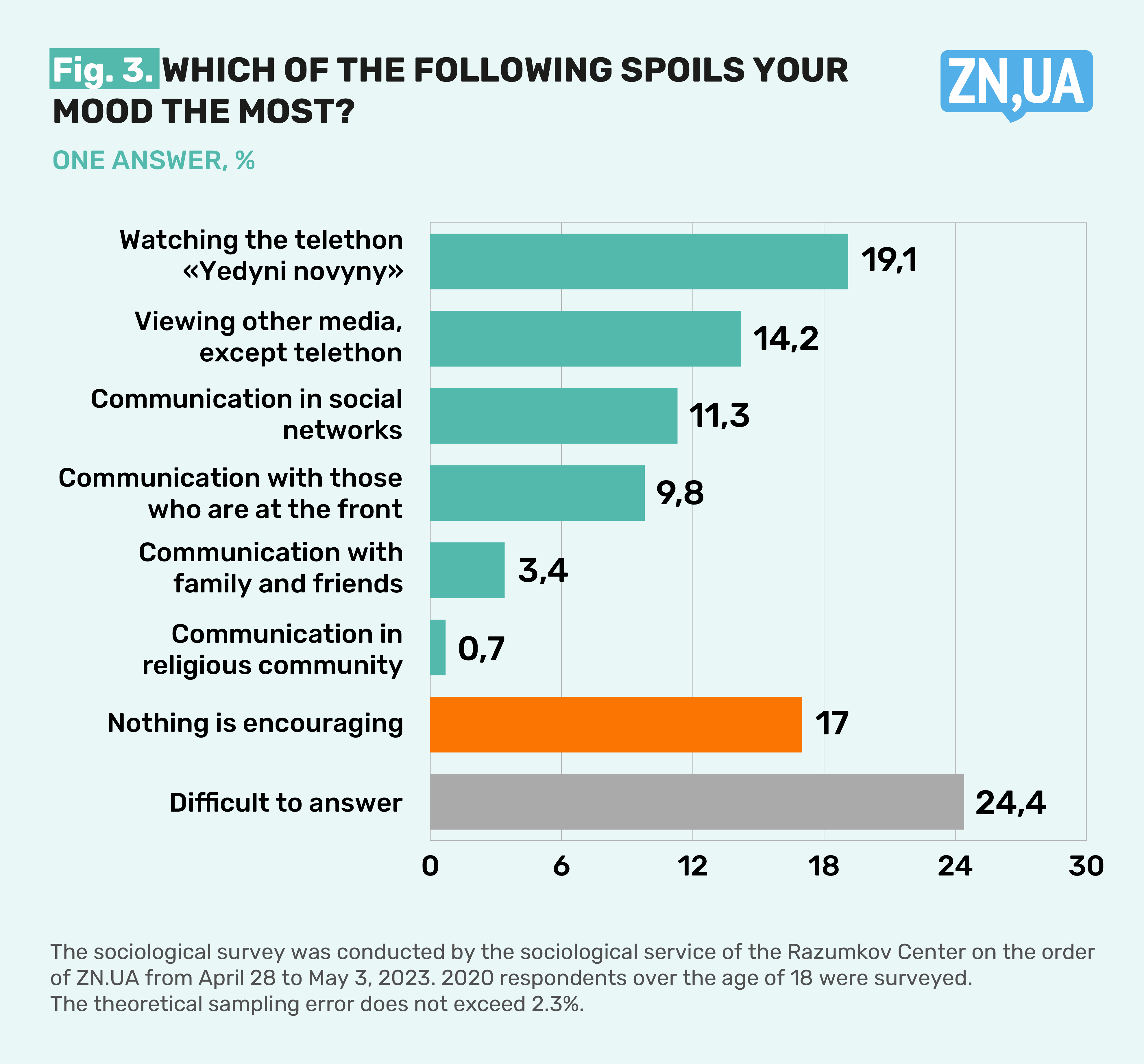 But when almost the same number of respondents (9.8%) answered the question "Which of the following spoils your mood the most?" (see Fig. 3), called "communication with those who are on the front", then we are talking about more private things. When the people worry about the soldiers, learning that they are in critical danger, exhausted, or forced to care about the supply; when conflicts occur – if combatants are expected to be actively involved in family matters, etc.