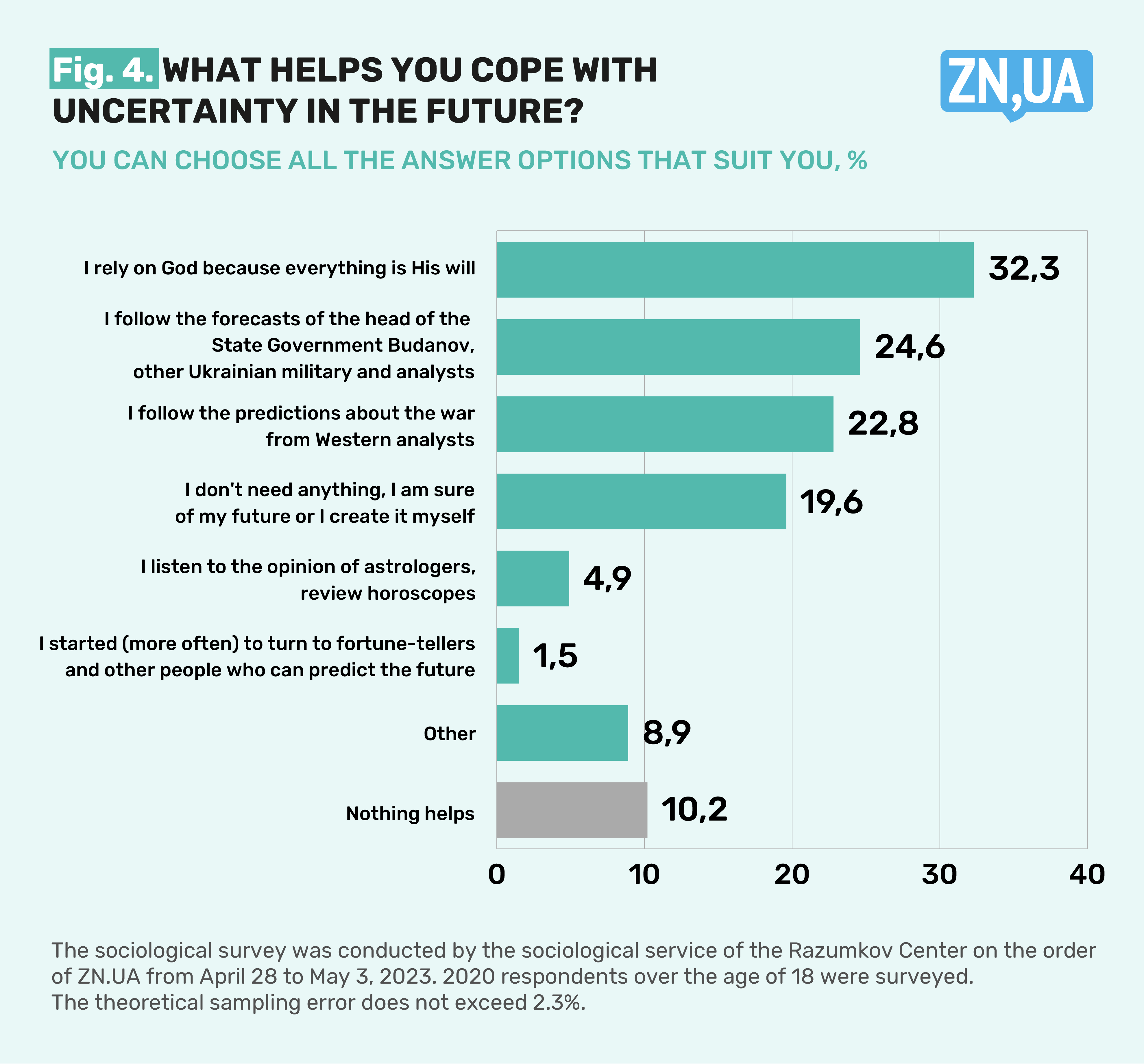This is evidenced by the answers to the question "What helps you cope with uncertainty in the future?" (see Fig. 4). 22.8% of respondents answered: "I follow the predictions about the war from Western analysts", and 24.6% –"I follow the predictions of the further development of events from the point of view of the head of the Main Directorate of Intelligence of the Ministry of Defense of Ukraine Budanov, as well as other Ukrainian military and analysts." People appreciated the role of primary sources. It would also be a positive factor if primary sources informed people, and did not manipulate their opinion...