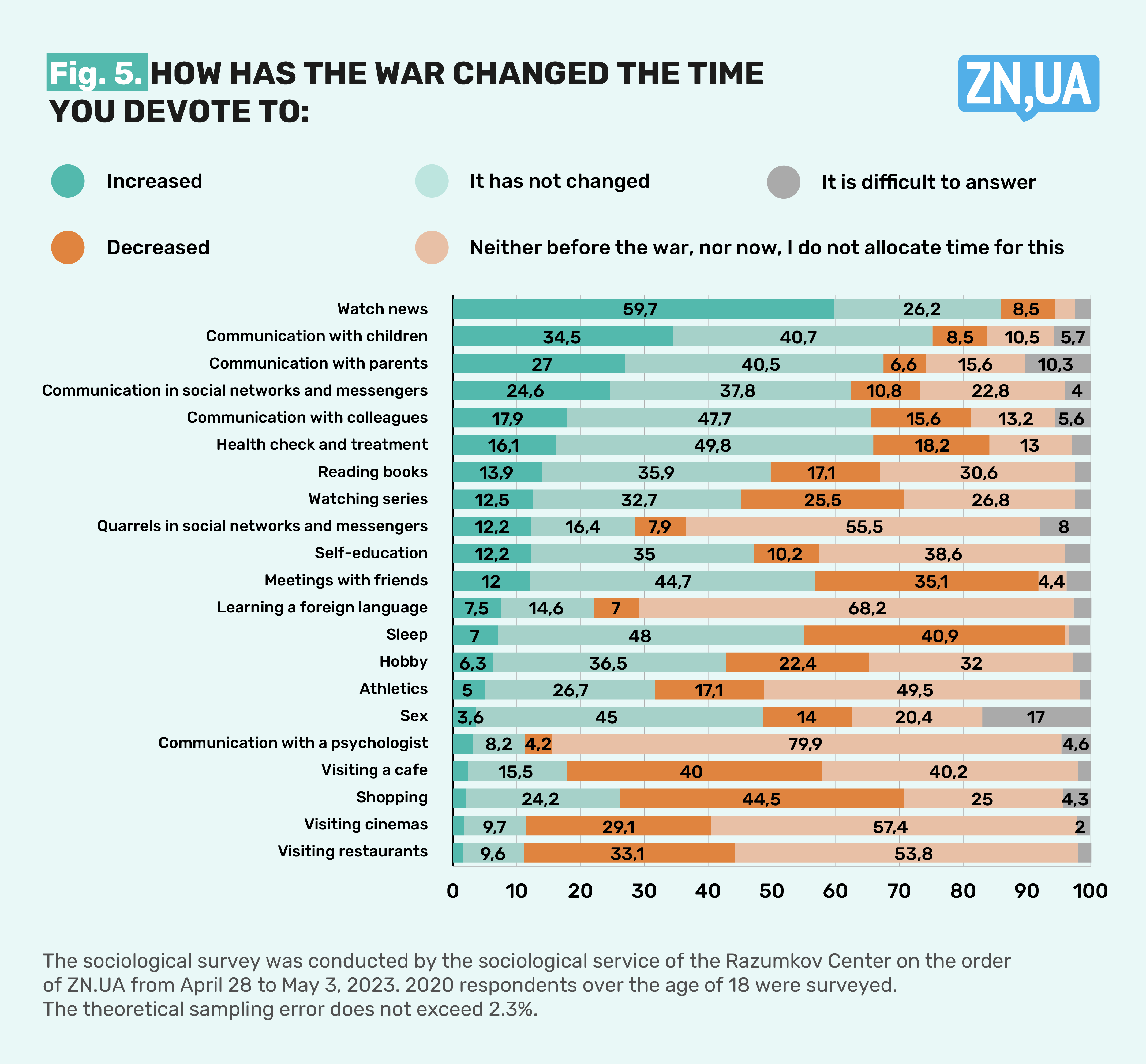 "How has the war changed the time you devote to hobbies, sports, visiting cinemas, cafes, restaurants, watching TV series, reading books, learning a foreign language, checking your health and treatment, self-education, watching news, communicating with children, parents, colleagues, meetings with friends, communication on social networks and messengers, quarrels on social networks and messengers, sleep, shopping, communication with a psychologist, sex?" – we asked the Ukrainians. And in each of the listed points, they were offered to choose one of the answers: "Neither before the war, nor now, I do not allocate time for this", "It has not changed", "Increased", "Decreased", "It is difficult to answer" (see Fig. 5).
