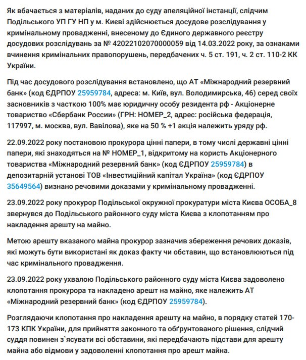 Domestic government loan bonds of Sberbank were arrested at the request of the prosecutor of the Podil district Prosecutor’s Office of the capital within the framework of criminal proceedings No. 42022102070000059, opened on March 14, 2022 (see document 3).