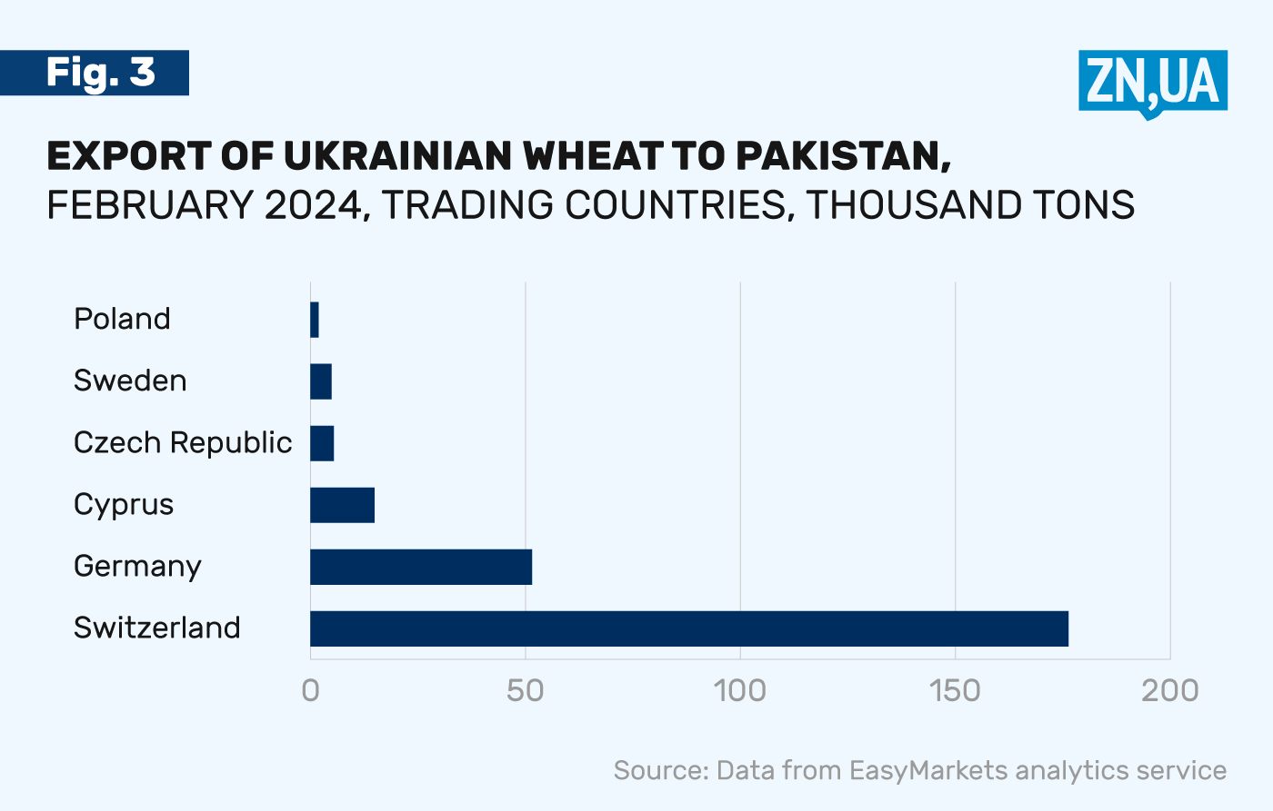 The situation is similar with supplies of Ukrainian wheat to Egypt or Spain or sunflower oil to China. This is a global problem of our commodity trade. When you read the happy news that Ukraine has increased grain exports to, for example, Pakistan, it is actually news that Switzerland has increased sales of Ukrainian wheat to that country. After all, for example, in February 2024 there was no direct delivery from Ukraine to Pakistan either (see Fig. 3).