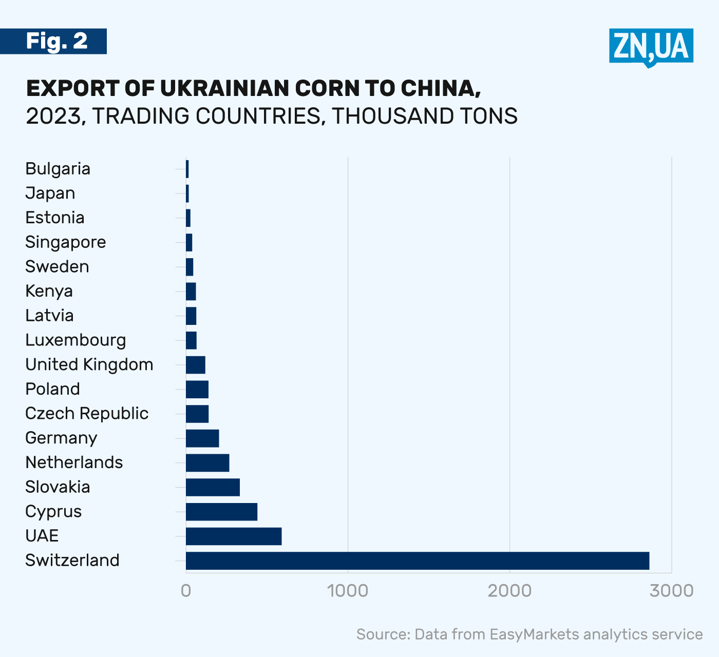 Let's look at deliveries of Ukrainian corn to China in 2023 – zero direct deliveries, everything goes there through third countries, the lion's share through Switzerland (see Fig. 2). There will be additional profits from resale (often to themselves), and a part of the foreign exchange earnings, and a share of the income tax. And most importantly, it is futile to hope that some invisible hand of the market will change something. The data for January 2024 are the same – there is no direct delivery, Ukrainian corn goes to China from Switzerland, UAE, Bulgaria, Cyprus and other countries.