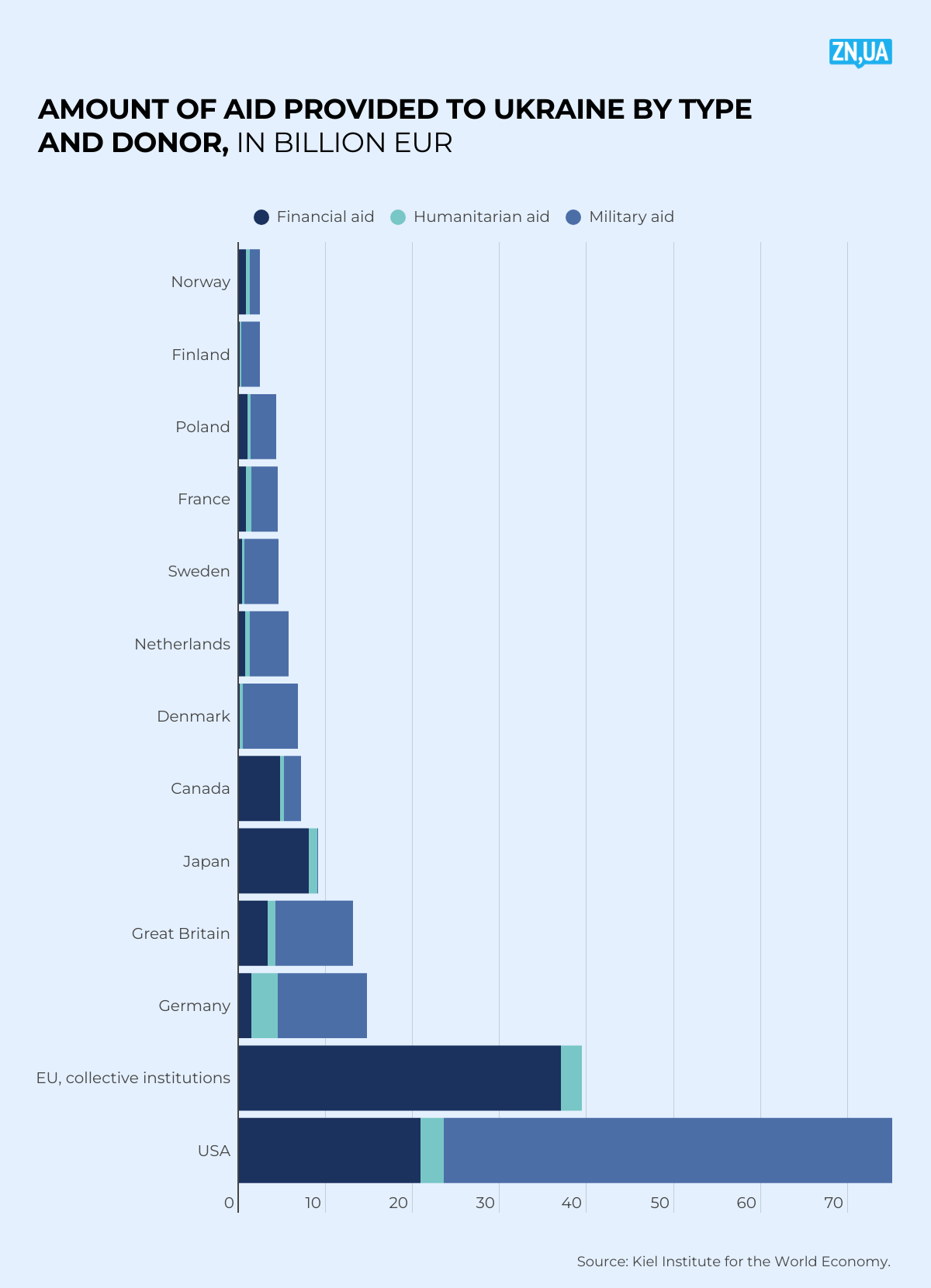 Among individual countries, the United States of America (EUR 98.4 billion in terms of commitments), Germany (EUR 24.8 billion), Great Britain (EUR 16.9 billion), Japan (12 .4 billion), the Netherlands (11.7 billion), Sweden (11 billion), Denmark (10.1 billion), Canada (8.2 billion euros). At the same time, the largest volumes of military aid were provided by the United States of America, Germany, Great Britain, Denmark and the Netherlands (see figure).