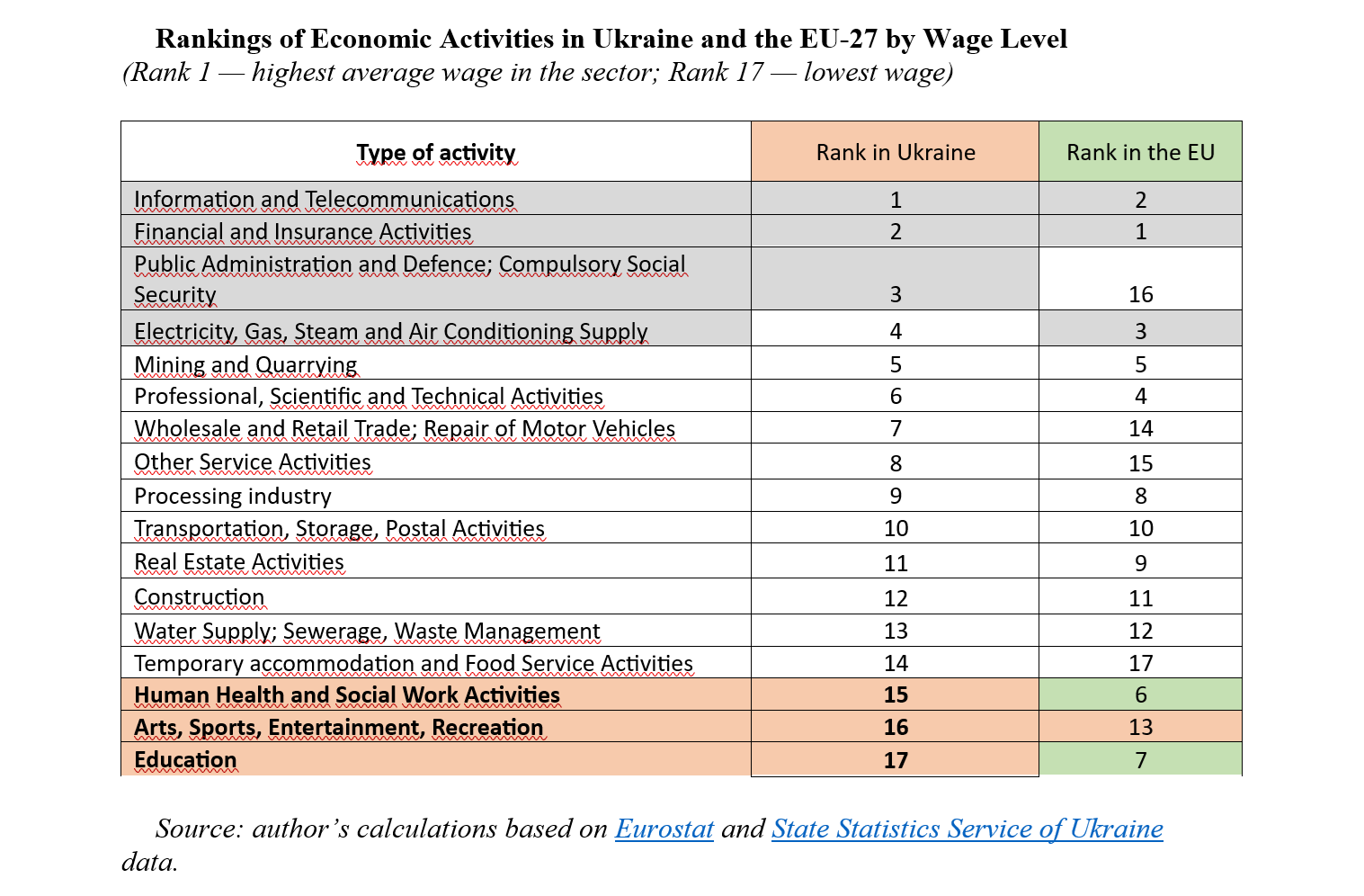 To assess wage indicators in Ukraine’s social and humanitarian sectors relative to other types of economic activity, we relied on data from the State Statistics Service of Ukraine and Eurostat. Our aim was to compare the rankings of different sectors by average wage levels in the 27 EU member states and in Ukraine. The results of the analysis are presented in the table.
