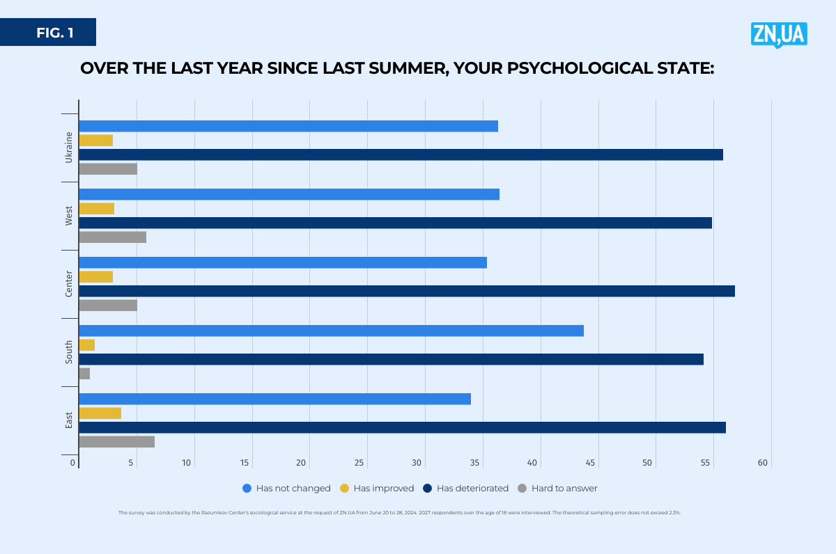 In roughly all regions of Ukraine the same number of respondents have reported that their “psychological state has not changed.” Unfortunately, the survey does not specify what exactly “has not changed” and what condition the respondents had in the middle of last summer.
