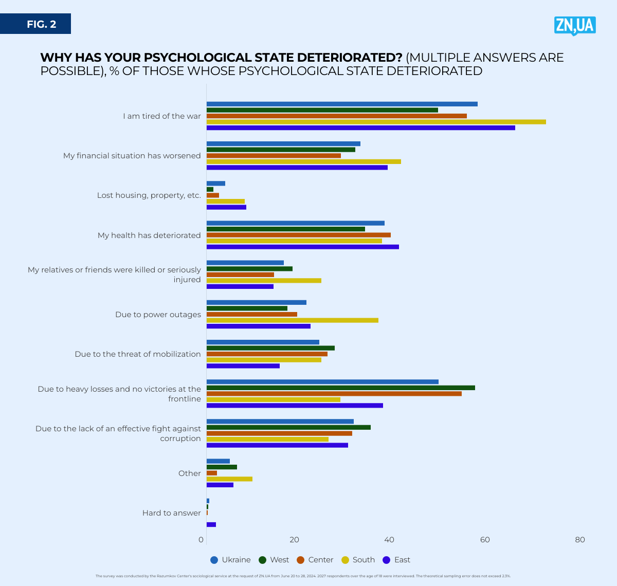 Residents of the eastern and southern regions put “deterioration of health” in the second place in terms of the impact on psychological well-being (40.3% and 36.8% respectively, 37.3% for Ukraine as a whole). At the same time, the west and the center are more concerned about heavy losses and lack of significant advances of defense forces at the frontline: 53.6% and 53.5%, respectively (in Ukraine as a whole, for 48.6% of citizens this reason ranks second).