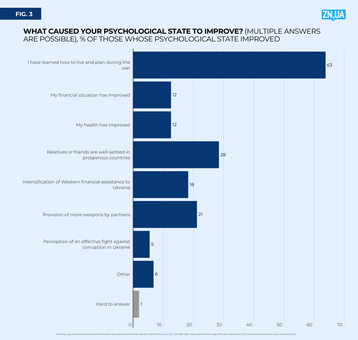 There are not many of them — only 2.9% of the total number of respondents. Nonetheless, the fact itself is encouraging, especially since the main reason for improvement depends more on the individual than on external factors. And this gives hope to those who want to change their condition. Among the factors that help to get out of the emotional pit, Ukrainians named improvement of planning and forecasting skills in an unstable situation (63.8%). In short it sounds like “I have learned how to live.” This is what our Israeli colleagues told us back in 2014. The ability to notice the course of life, to plan what depends on the person herself, taking into account factors that do not depend on her, proactive behavior, the chosen stable life stance — these are not only factors of survival and mental stability, but also stepping stones for development.
