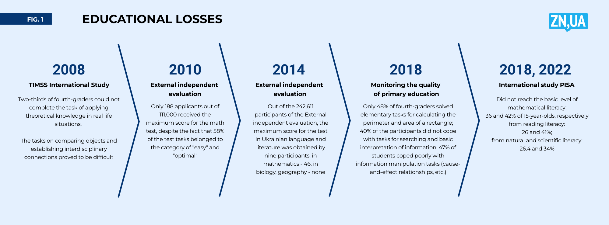 In our country, it is customary to say that all the problems in the education system arose because of covid and the war. Yes, they really caused great educational losses, the real volumes of which we do not even know (because no one measured them). However, it is worth honestly admitting that the war and covid hit an already faulty education system that was not functioning very well and that our educational losses began a long time ago. It is worth recalling the results of the External independent evaluation of different years, the results of domestic monitoring of the quality of primary education and international studies (and not only Program for International Student Assessmen (PISA), but also Trends in Mathematics and Science Study (TIMSS)). Every time after they were published, society was very worried, experts discussed what to do, and various ministers promised to take decisive steps to correct the situation... But the problems remained and had already entered a chronic stage. I can illustrate them with examples that I chose from ZN.UA publications.