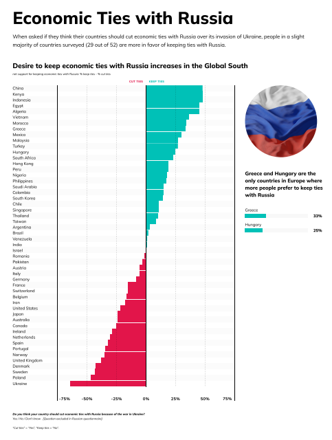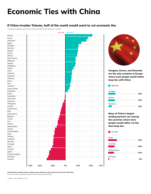This is also the response of citizens of half of the countries surveyed when asked whether they support maintaining economic ties with China in the event of its invasion of Taiwan.
