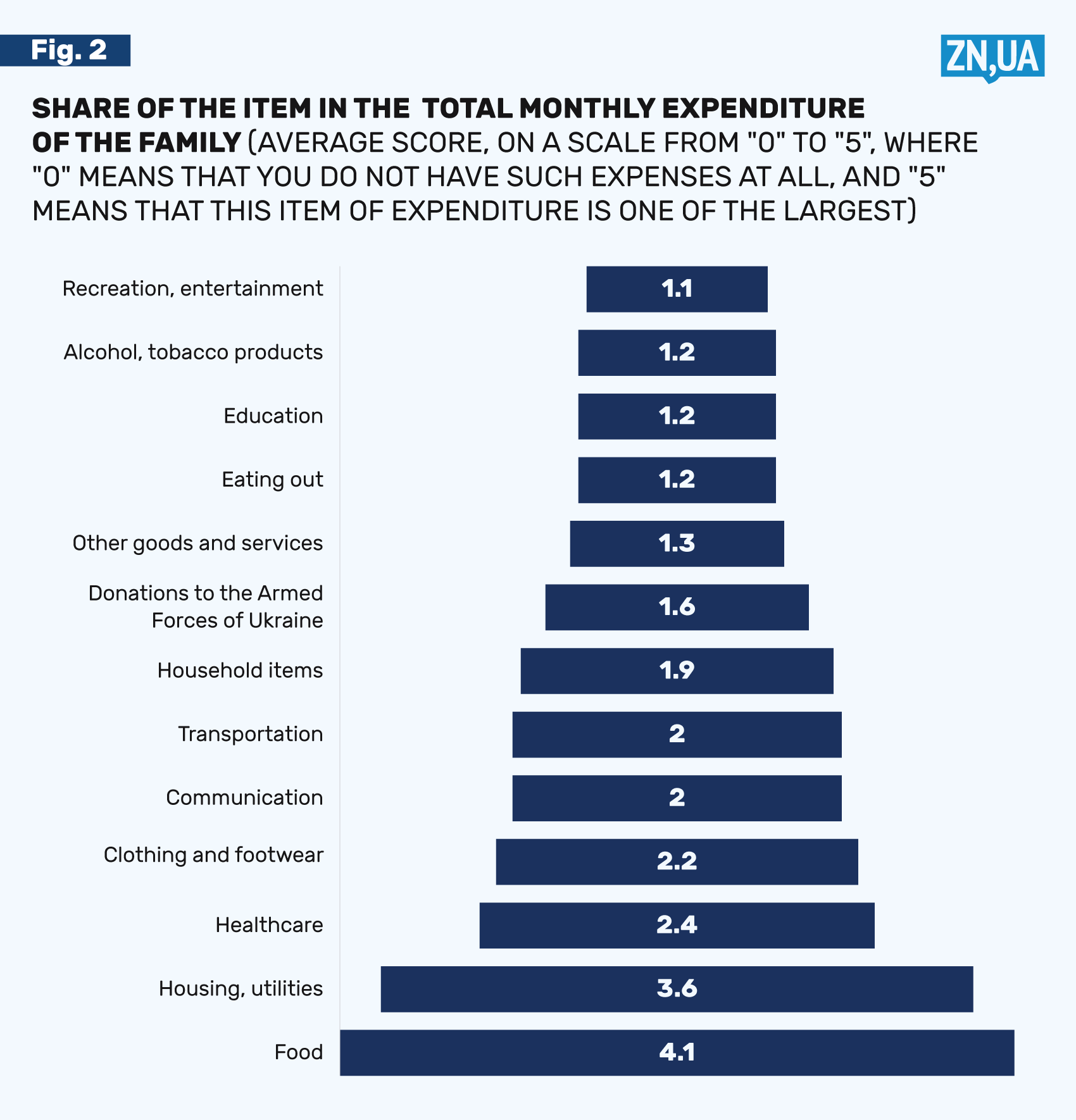 What do Ukrainian families spend their money on? We asked respondents to rank the most common expenses by the share they make up in the family budget (on a scale from “0” to “5,” where “0” means that there are no such expenses at all, and “5” means that this item of expenditure is one of the largest). Figure 2 shows the average scores that the expenses received.