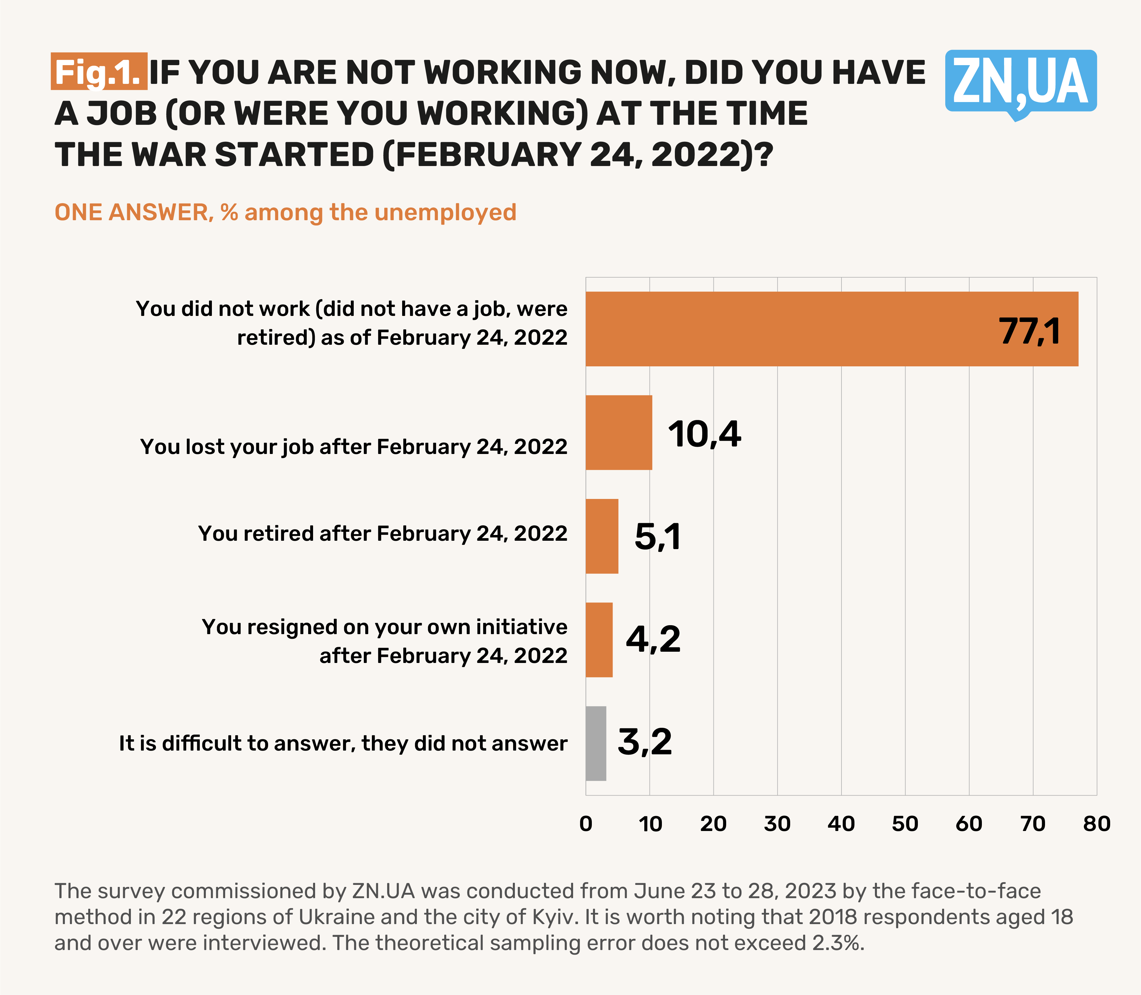 Among currently unemployed Ukrainians, 77% did not work even before full-scale hostilities, another 5% of people retired after the start of the war (probably these are people who were working pensioners). But 10.4% of the current unemployed lost their jobs after February 24, 2022, and another 4.2% of the surveyed citizens resigned on their own accord from the same date. So, the usual conditions of work and, in fact, life changed with the beginning of the war for almost 15% of our fellow citizens (see Fig. 1).