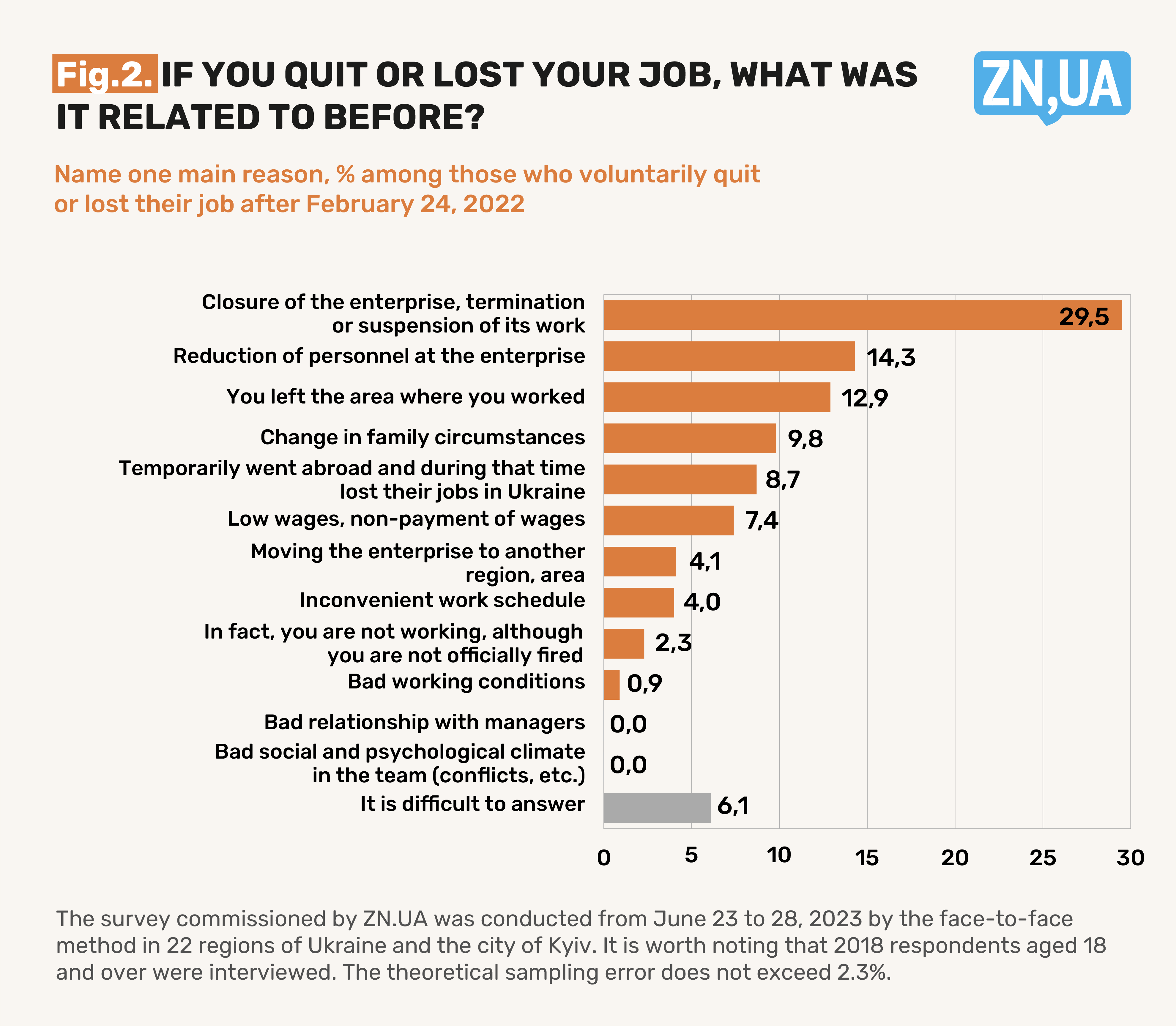 The reasons for job loss are different, but mostly they are related to problems with employers and forced migration (see Fig. 2). Thus, 29.5% of those people who resigned on their own initiative or lost their jobs after February 24, 2022, indicated the option "Closing of the enterprise, termination or suspension of its work" as the main reason why it happened. It is worth noting that 14.3% of citizens cited the reduction of personnel as the main reason, 12.9% of people lost their jobs because they left the area where they worked, and 8.7% of the respondents – because they temporarily moved abroad and lost their jobs during that time. A little more than 4% of Ukrainians, on the contrary, did not agree to the relocation and lost their jobs due to the relocation of the enterprise to another region. For almost 10% of respondents, the reason for job loss was family circumstances that changed with the start of a full-scale invasion. Almost 7.5% indicated that the reason for dismissal was low wages or non-payment of wages. Reasons common to peacetime, such as the work schedule, working conditions, relations with the management or the atmosphere in the team, have obviously given way to more important and serious reasons.