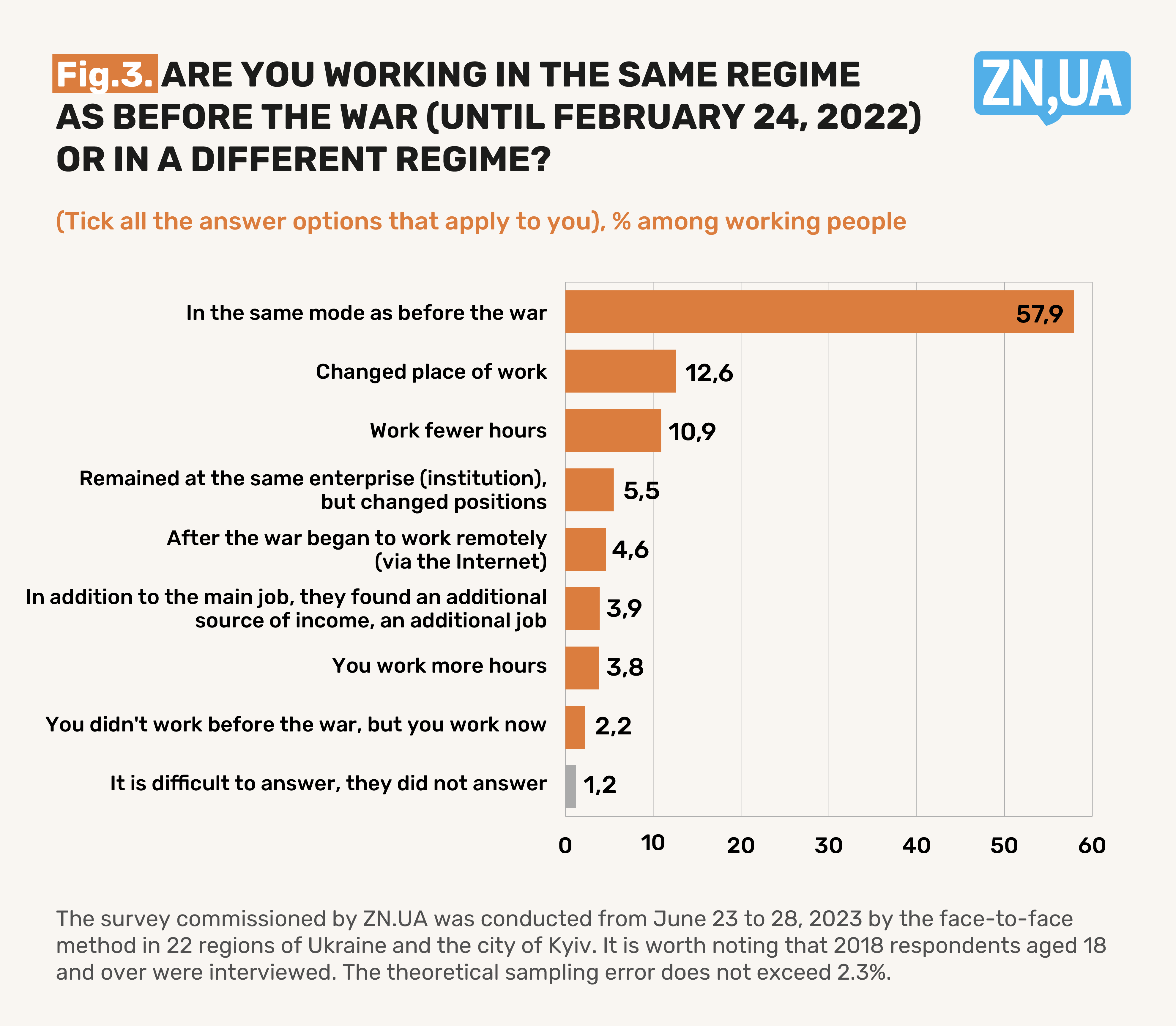 The life of those who have a job has changed for almost 40% of the currently employed (see Fig. 3). We asked them if they were working in the same mode as before the great war. It is important to note that 57.9% of respondents gave a positive answer to this question. On the other hand, 12.6% of people said that they had changed their place of work since February 24. Almost 11% of Ukrainians work fewer hours than before. In addition, it is worth mentioning that they worked at the same company until the start of hostilities. It can also be noted that 5.5% of the surveyed people changed their position, and 4.6% switched to remote work. Almost 4% of people, in addition to the main job, found an additional one, and 2.2% of the respondents started working, although they were not employed before the war.