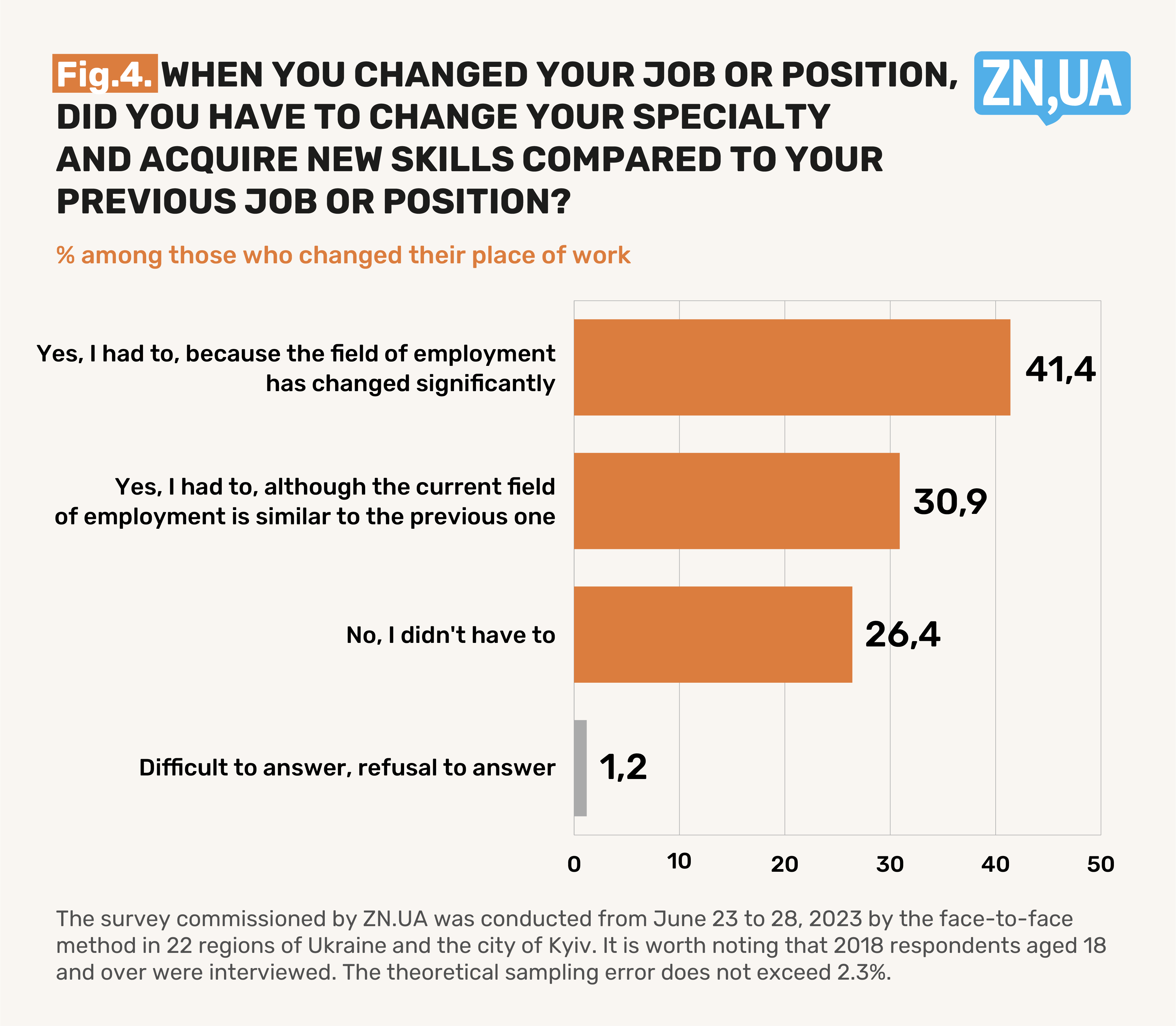 Among those who changed jobs since February 24, more than 70% of respondents indicated that they had to change their specialty and acquire new skills (see Fig. 4). More than 40% of these people decided to make these changes in their lives because the sphere of their employment changed significantly. In addition, it is noted that 30% of Ukrainians stayed to work in a related field, but were still forced to learn new things. Only 26.4% of respondents managed to change jobs without changing their qualifications.