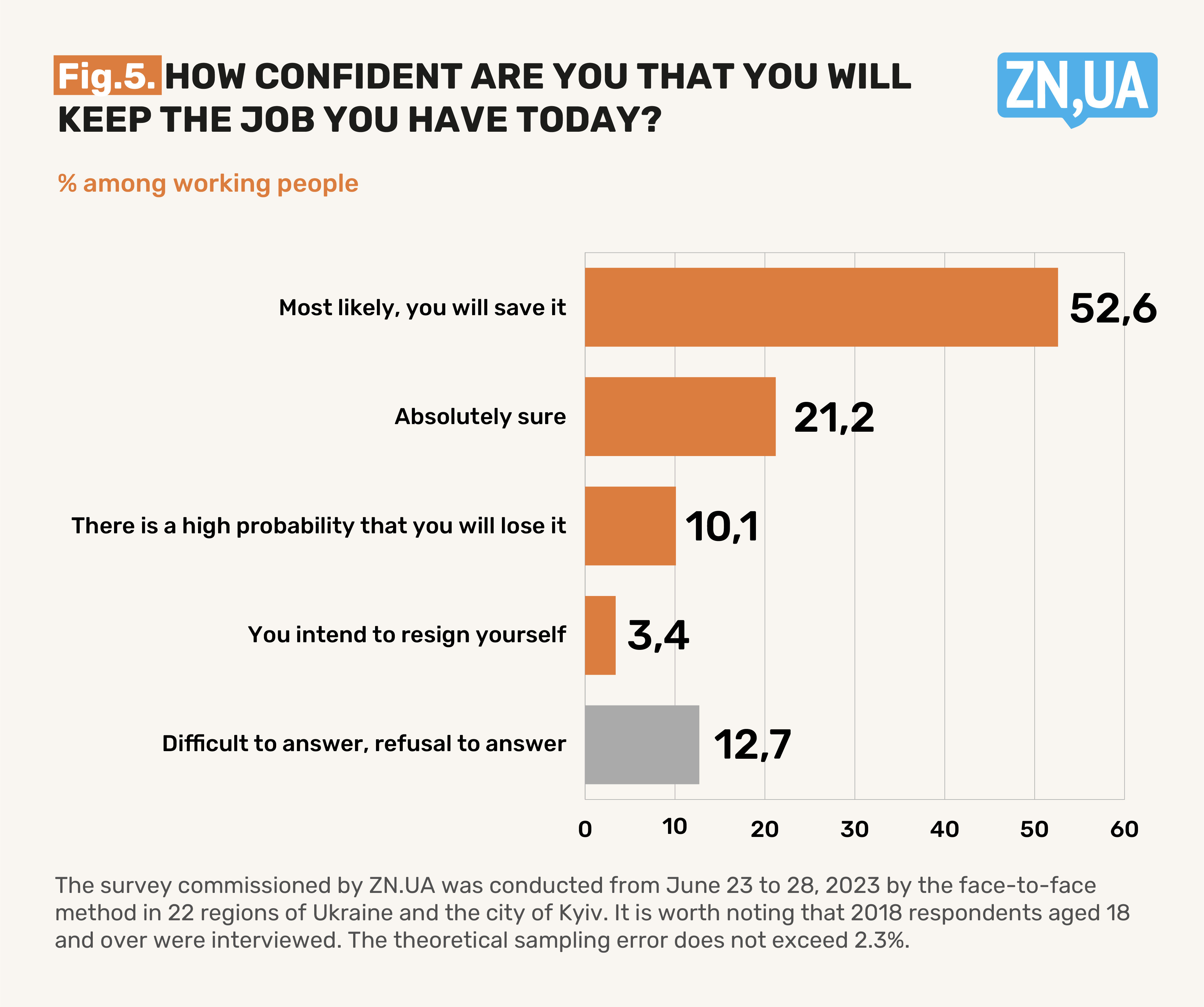 Our current extreme experience that we received during full-scale military operations in our country should teach us flexibility and constant readiness for change. However, this experience has not taught us anything yet. When answering the question "How confident are you that you will keep the job you have today?", more than half (52.6%) of employees chose the answer "most likely." In addition, 21.2% of the surveyed people are absolutely sure that this will be the case (see Fig. 5). Unheard-of optimism prevails in society, given the circumstances. However, this optimism is associated with great risk. After all, the certainty that a person will always occupy a certain workplace is the best negative factor that demotivates a person to develop alternative skills, acquire new knowledge or additional qualifications. This is the kind of optimism that harms a person's professional development. It is extremely difficult to explain, taking into account the traditional type of work for our society, namely work according to the received profession and education.