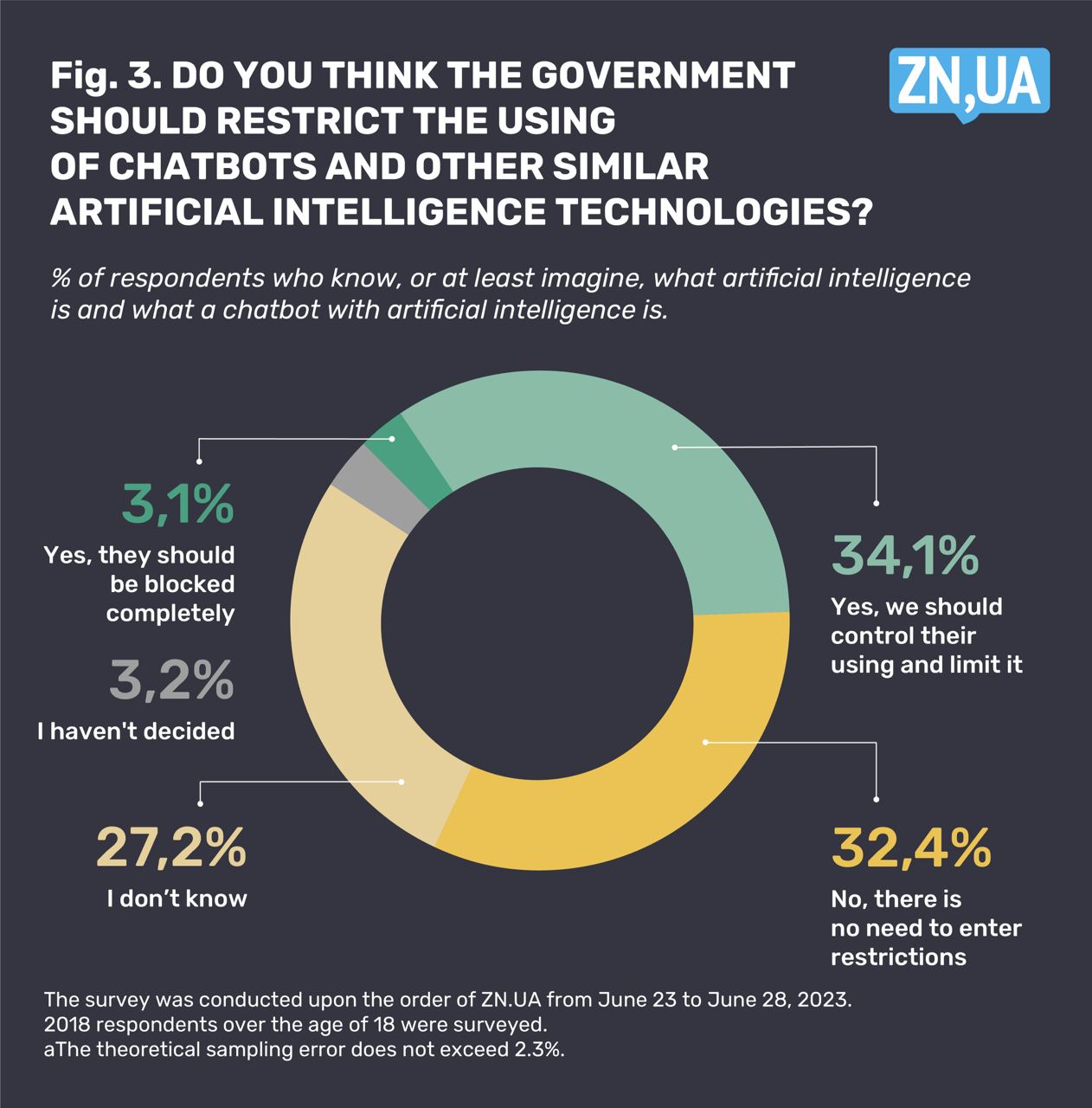 Despite the fact that AI technology is already exacerbating all existing problems in the media sphere, the attitude of Ukrainians to its spread is very heterogeneous. It is worth noting that more than 27% of respondents chose the "don't know" option when answering the question whether the state should limit the use of chatbots and other similar artificial intelligence technologies. And this is not from among all the people who participated in the survey, but only among those who know or at least imagine what artificial intelligence and chatbots that use it are. Another 32.4% of respondents believe that the technology does not need any restrictions. Only 34% of Ukrainians indicated the need for control and restrictions. As for the radicals who are convinced that technologies should be completely blocked, there are only 3% of them in Ukraine (see Fig. 3).