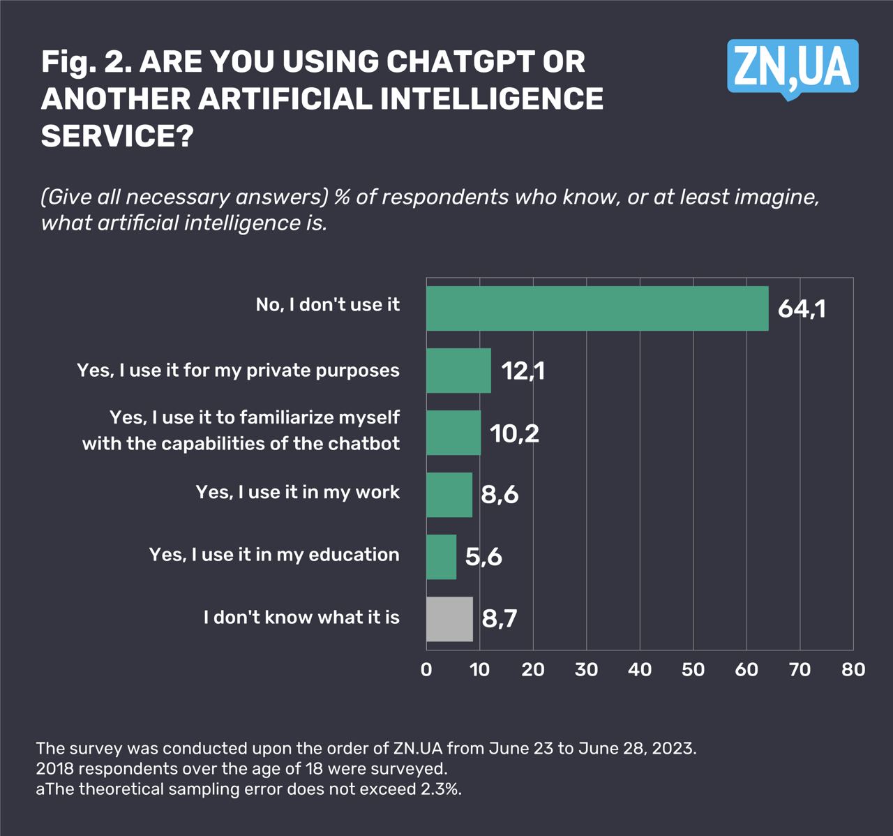 In fact, even the global GPT chat boom, as it turned out, largely bypassed Ukraine. To the question "Do you use ChatGPT or another AI chatbot?" 64% of respondents answered that they do not use such chatbots, 8.7% do not know what they are at all, and the rest really mostly play with technology: 10.2% of respondents use them for educational purposes, 12% of people for private purposes. Only 5.6% of respondents use AI chatbots in education, and 8.6% in work (see Fig. 2). Of course, most of them are people from 18 to 39 years old.