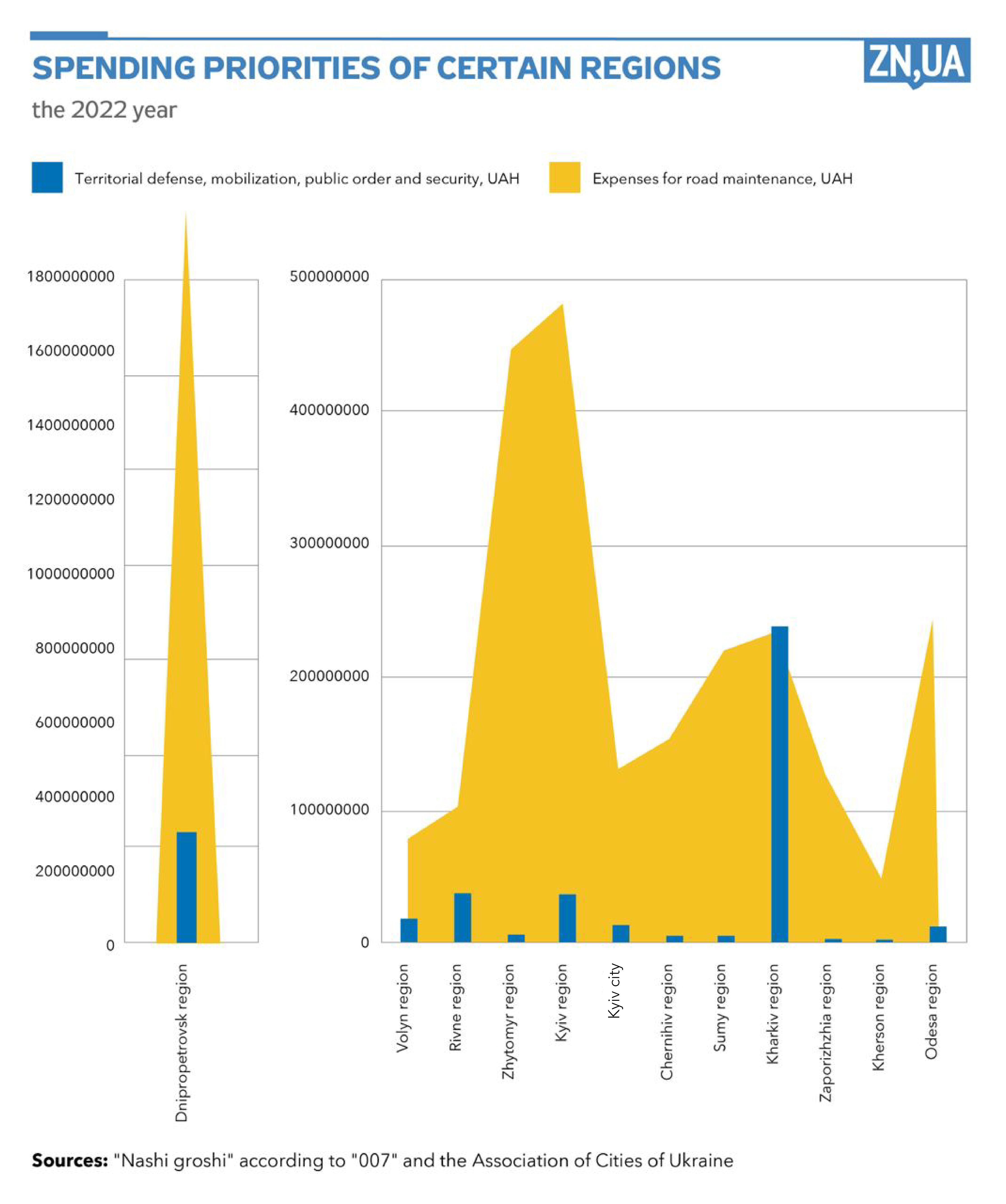 Expenditures on road maintenance exceed expenditures on public transport, public safety and mobilization by ten times: Sumy region — 218 million UAH for roads, 5 million for security, Chernihiv region — 153 million for roads, 5.5 million for security, Odesa region — 242 million for roads, for security 12 million, Kyiv region — 130 million against 13 million, Zhytomyr region — 443 million against 4.8 million UAH.