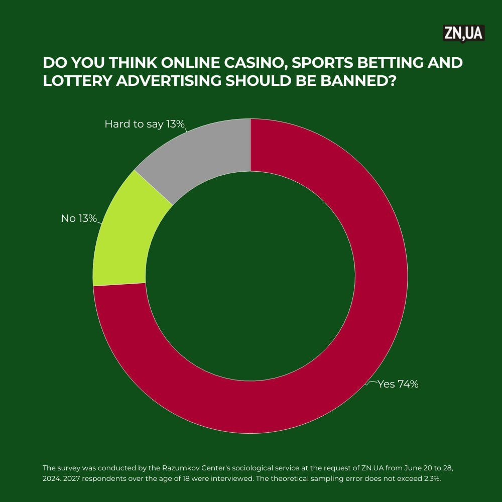 74% of Ukrainians believe that online casino and sports betting advertising should be banned, while only 13% support the presence of advertising.
