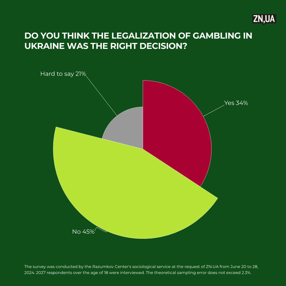 This position is endorsed by Ukrainians. In a sociological survey commissioned by ZN.UA and conducted by the Razumkov Centre in June 2024, respondents were asked: “Do you think the legalization of gambling in Ukraine was the right decision?”