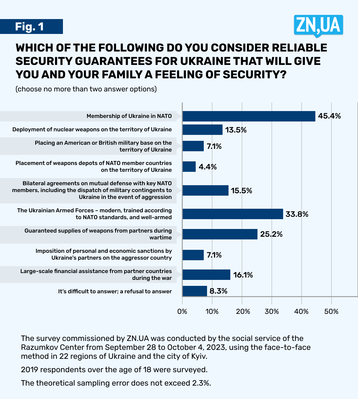 We asked our fellow citizens: “Which of the following do you consider reliable security guarantees for Ukraine that will give you and your family a feeling of security?” (Respondents could choose no more than two answer options.)