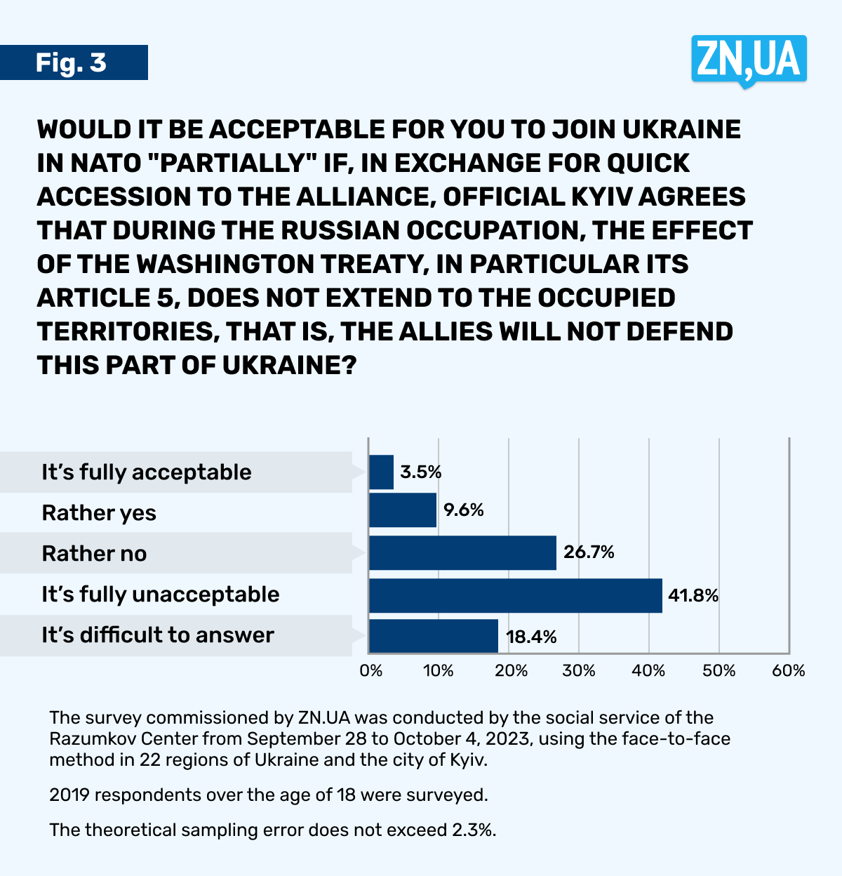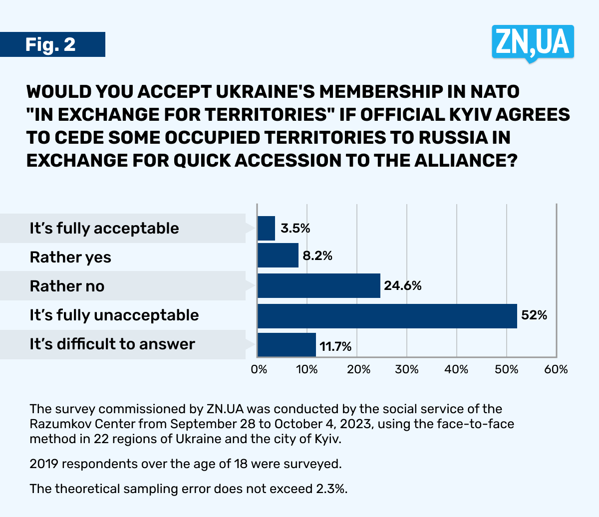 Let us recall that earlier the dire Director of the Private Office of the NATO Secretary General, Stian Jenssen, suggested that in order to achieve NATO membership, our country could cede some occupied territories to Russia. However, as follows from the results of a survey by ZN.UA and the Razumkov Center, in general only 11.7% of respondents are ready to accept such an exchange, while 76.6% are against it. (Fig. 2) And this is despite the fact that almost half of Ukrainians believe that NATO membership is a reliable guarantee of security that will provide them and their families with a sense of security!