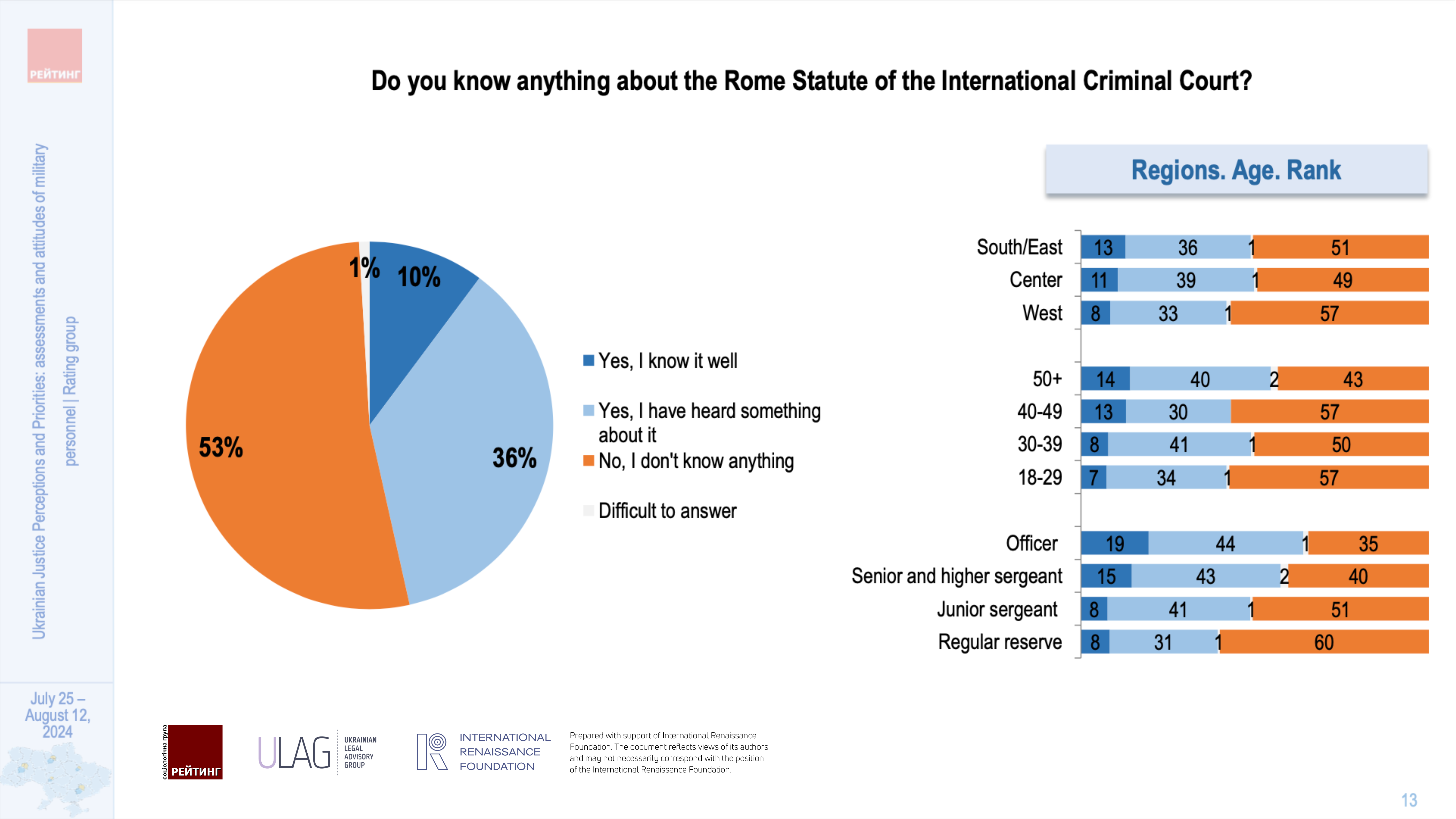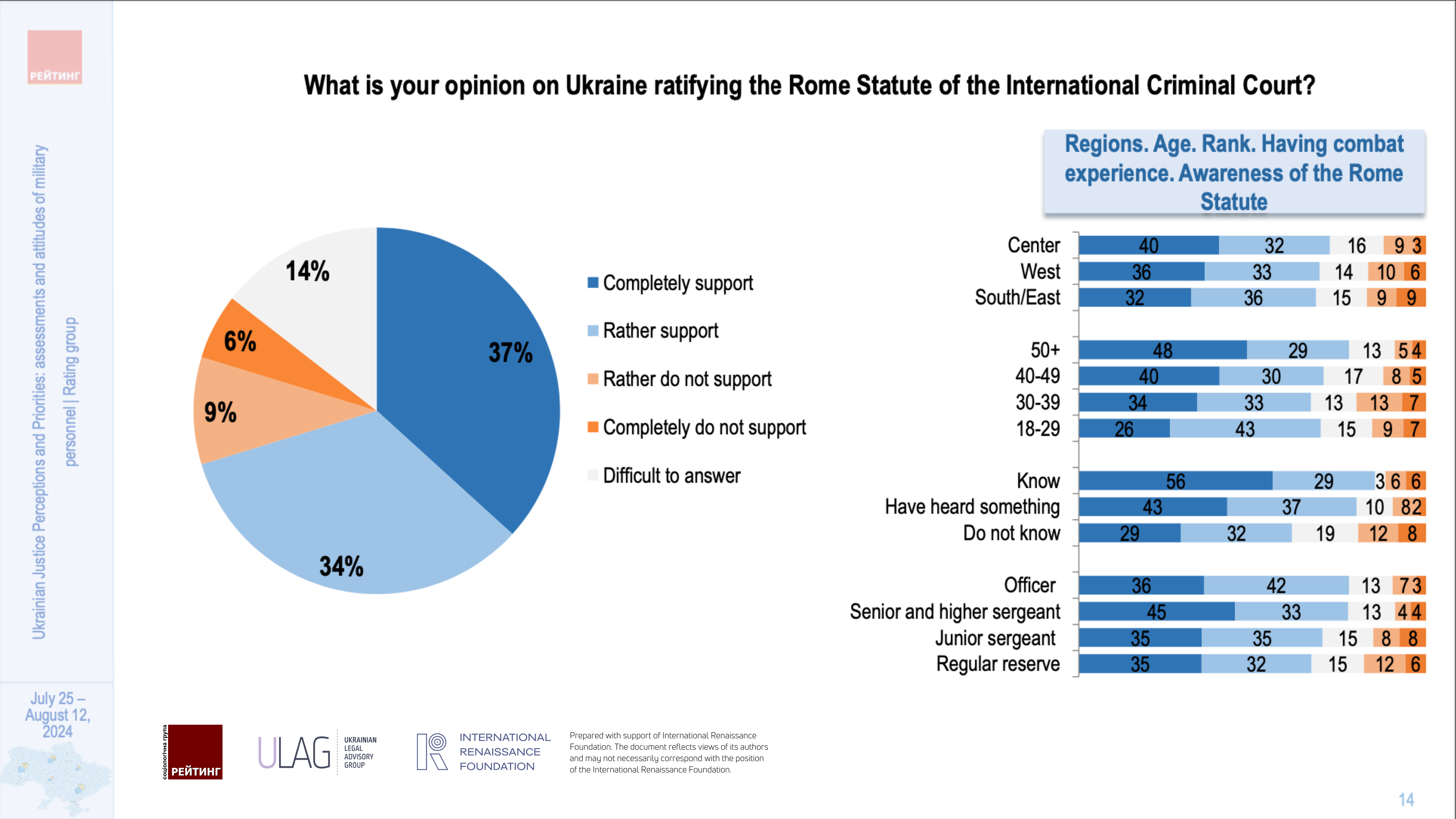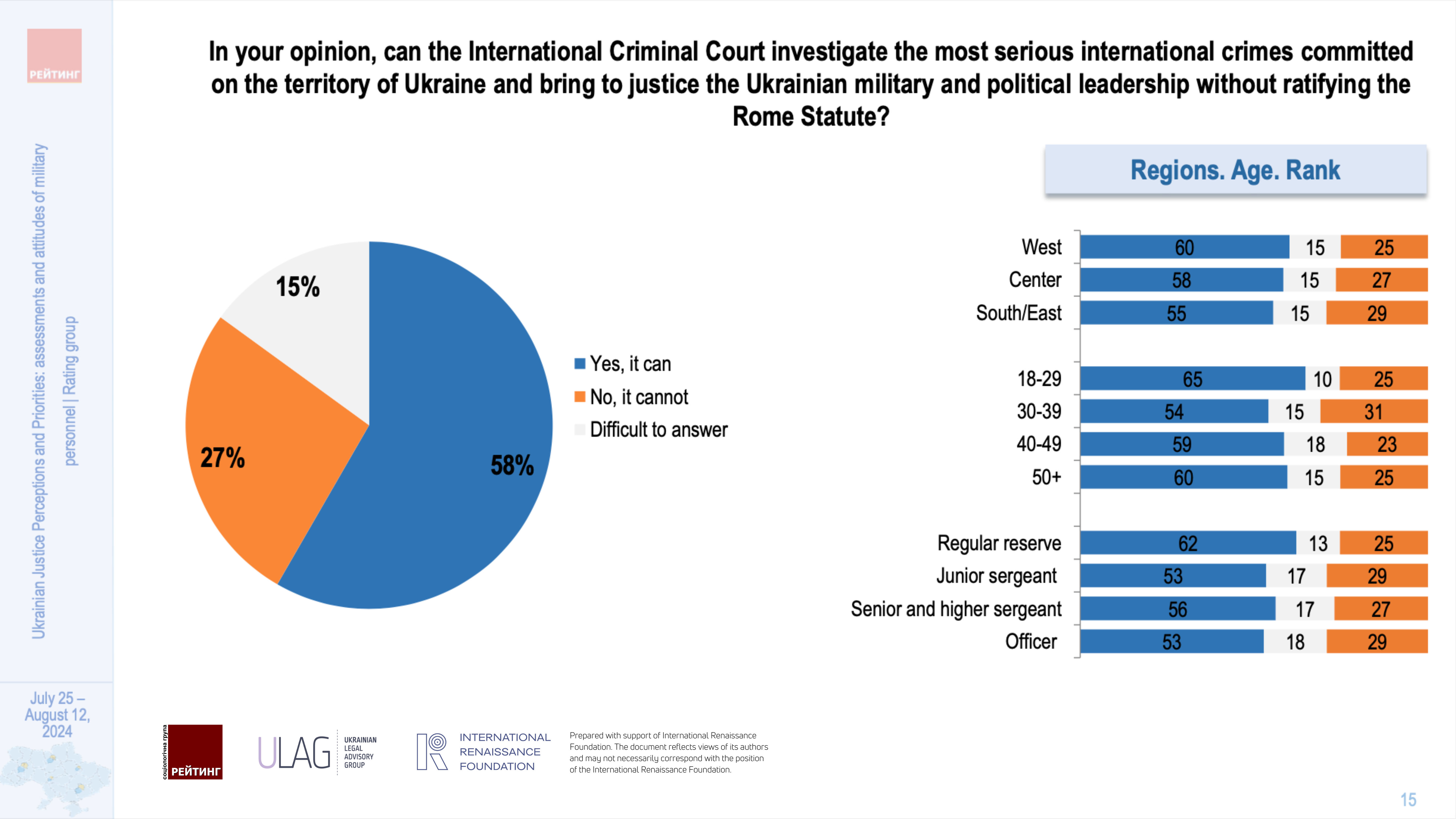 Ukrainian military personnel are also aware of this. The Sociological Group “Rating” and the Ukrainian Legal Advisory Group NGO, with the support of the International Renaissance Foundation, conducted a sociological survey among military personnel to gather their opinions on various aspects of justice during the war. According to the survey, 58% of respondents believe that the ICC can investigate the most serious international crimes committed on the territory of Ukraine and prosecute Ukrainian military and political leaders without the ratification of the Rome Statute.