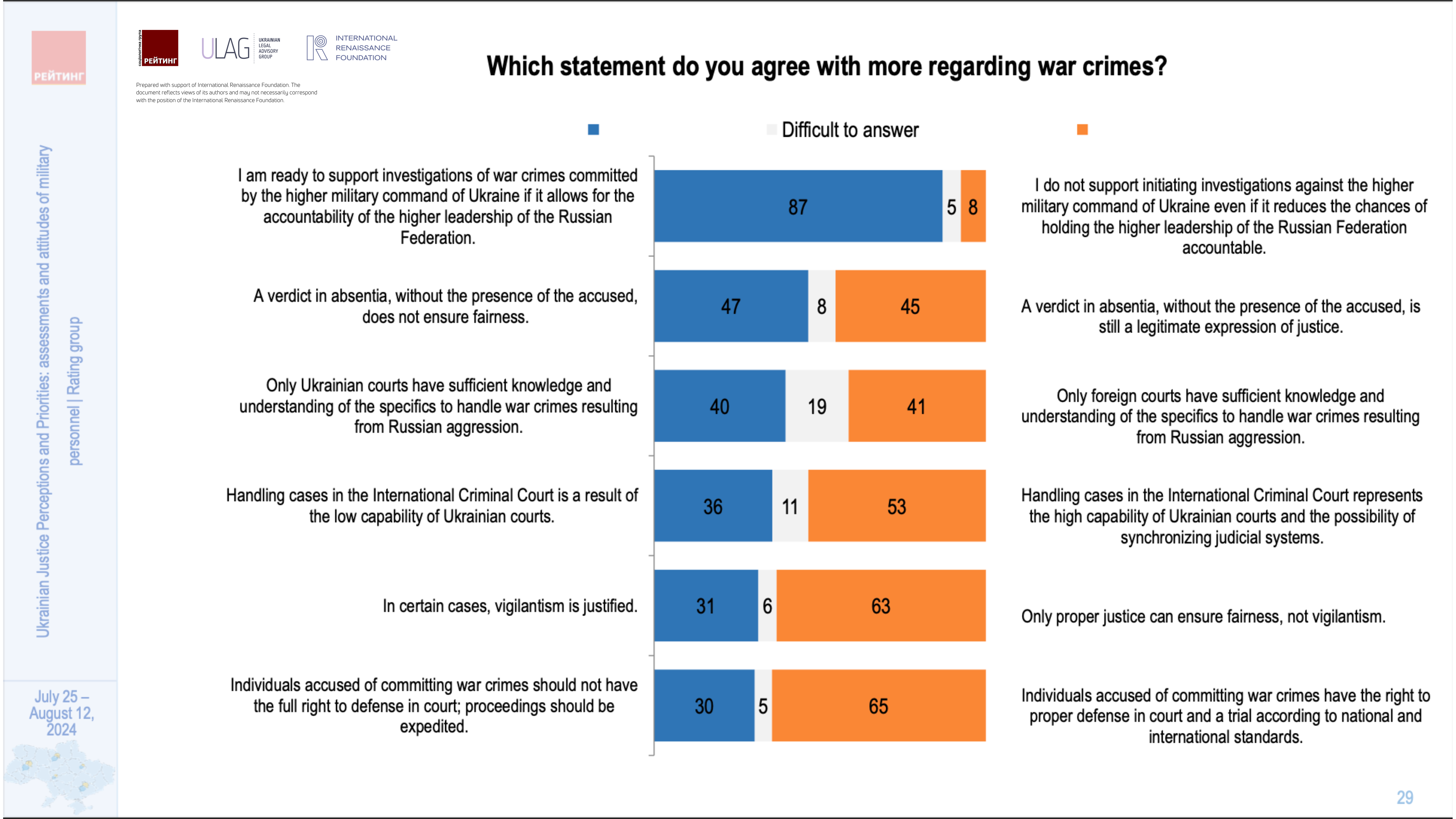 In addition to the support for ratification mentioned above, the vast majority of military personnel are ready to support the investigation of war crimes committed by Ukraine's senior military leadership in order to hold Russia's top leadership accountable. As previously mentioned, due to its mandate and resource constraints, the ICC handles only a small number of cases, primarily focusing on "top perpetrators." So do we really need Article 124, which would protect some members of the military leadership from potential prosecution while also risking denying many victims of war crimes their chance for justice?