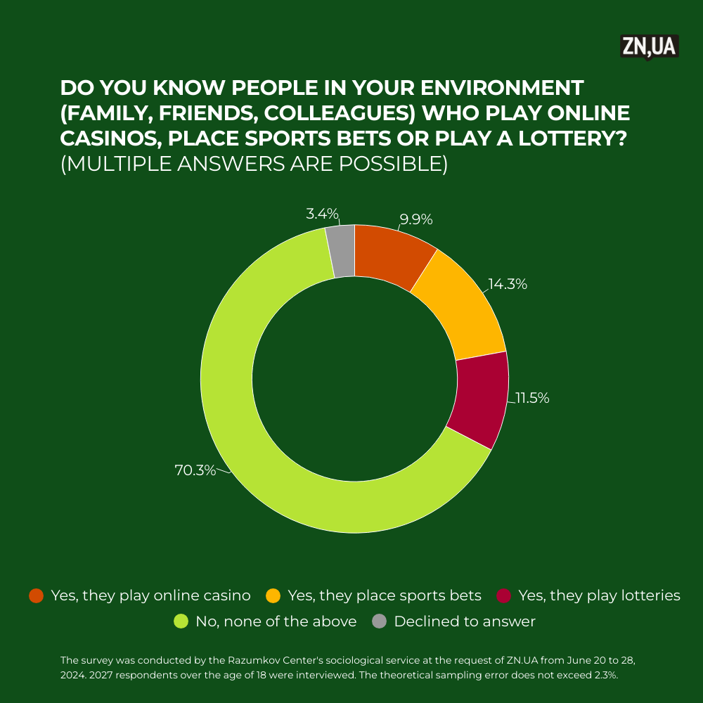 — But 8.5% of respondents in total admitted that they played in an online casino and made sports bets. And this is a fairly high figure, given that most people are really dishonest with sociologists and are embarrassed by such hobbies. After all, it is no secret that in the public space, online casinos and sports bets are not considered something socially acceptable. Thus, this figure means that 8.5% are only those Ukrainians who honestly admitted that they honestly admitted their passion for gambling. But in fact, this figure is 2-3 times higher. Which, in fact, is confirmed by the subsequent answers, where, it is worth noting, people talk not about themselves, but about others. It is always easier to give away the secrets of others.
