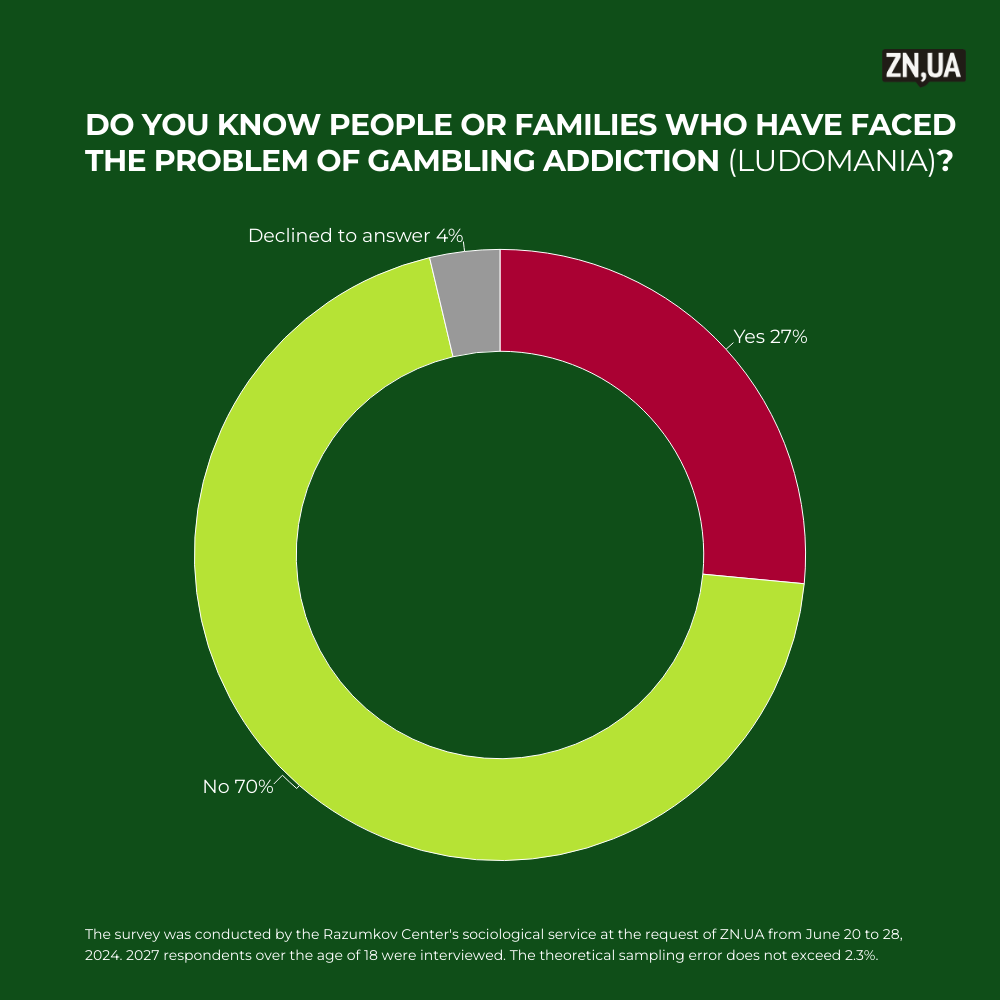 — But let's go further and delve into this problem even deeper. ZN.UA asked Ukrainians: "Do you know people or families who have encountered the problem of gambling addiction (ludomania)?" Obviously, the numbers of answers correlate with the previous ones. While there are 70% of people who have not encountered this problem in their circle, there are 27% of those who personally know addicted people or families where gambling addicts live.